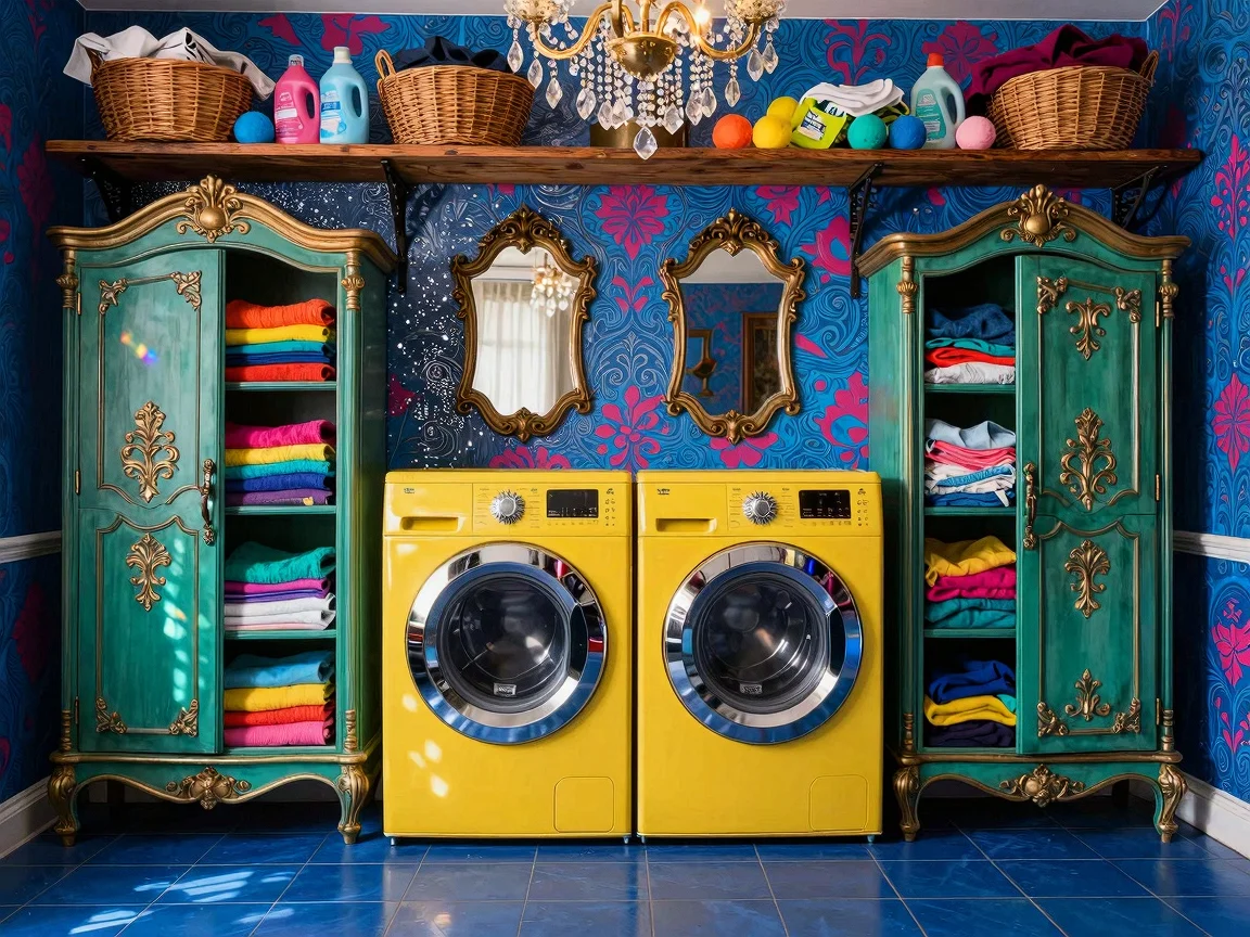 A vibrant lemon yellow washing machine and dryer set against a cobalt blue tiled floor with ornate silver trimmings, surrounded by a baroque styled cabinet and an antique wooden armoire filled with colorful laundry, topped with a ceiling-high shelving unit made of reclaimed wood, lush patterned wallpaper, and a crystal chandelier.