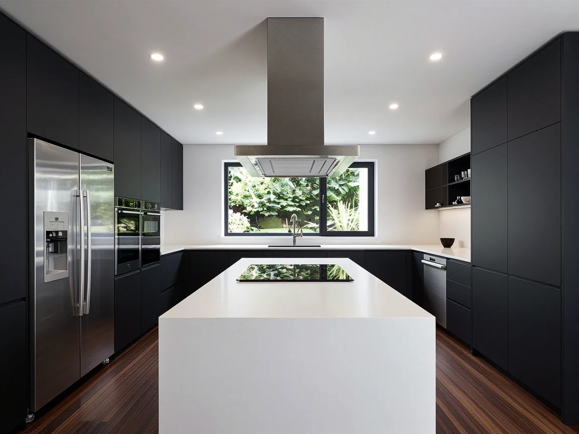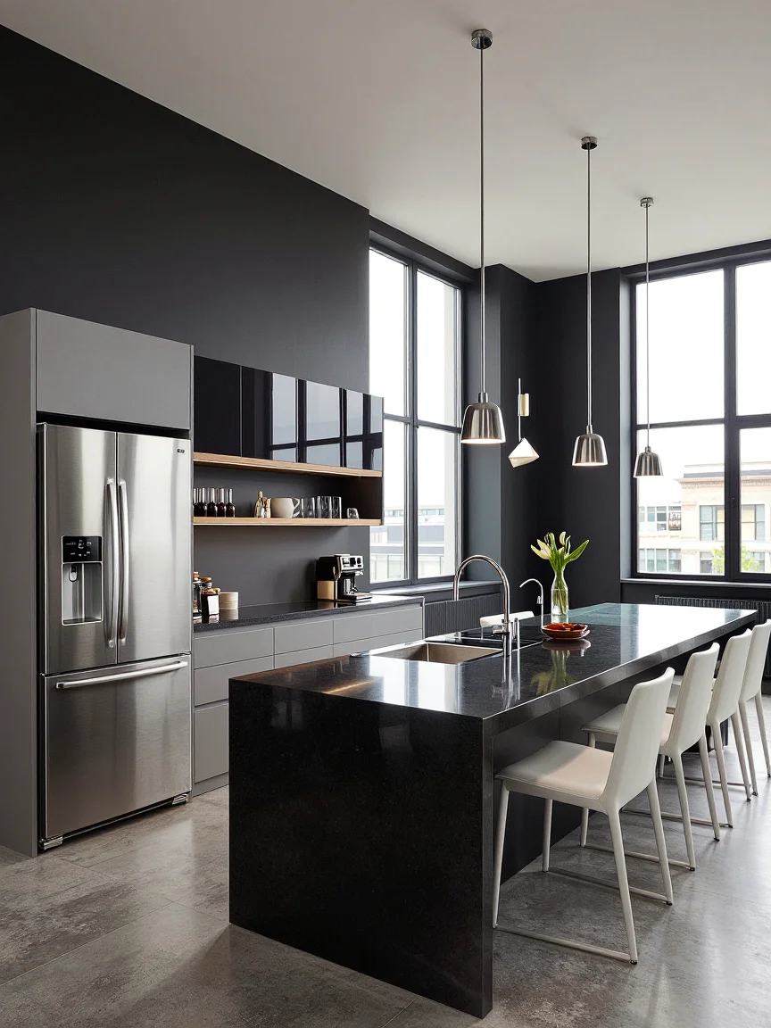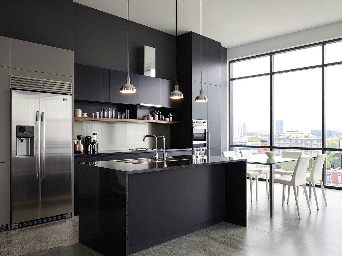 Modern kitchen with large windows, monochromatic colors, matte charcoal grey cabinetry, white quartz countertop island, stainless steel appliances, breakfast nook with glass table and acrylic chairs, dark walnut floor, and indoor plants.