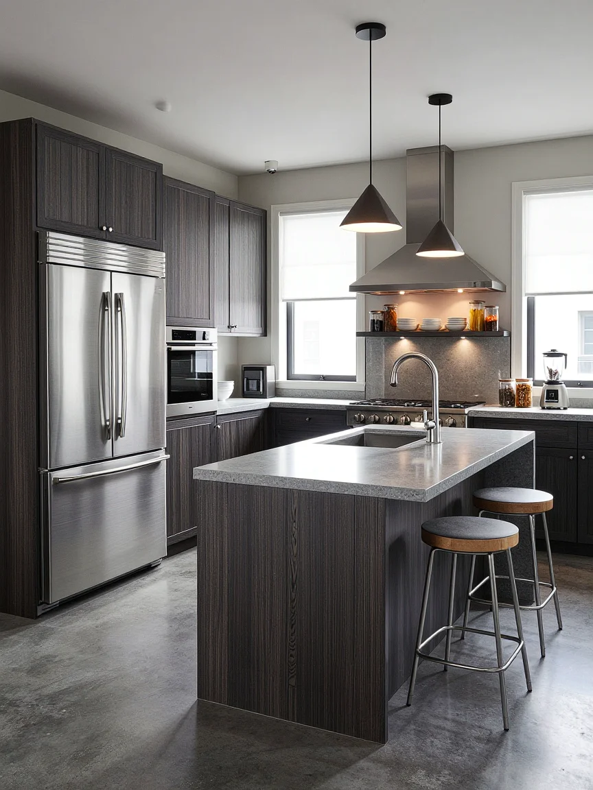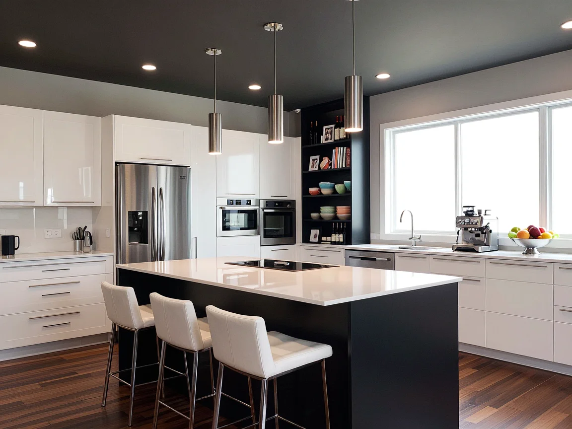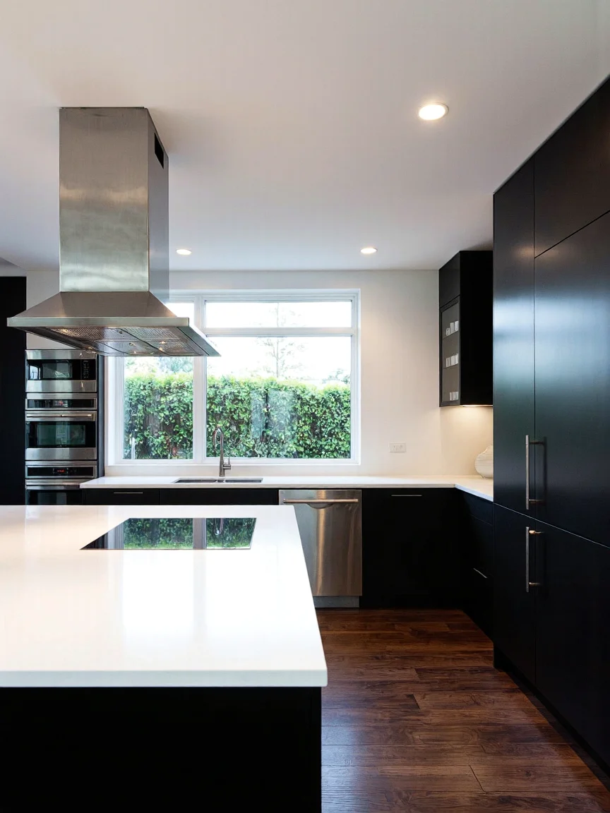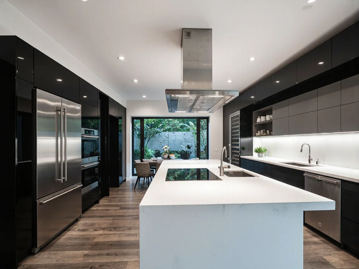 Modern kitchen with large windows, monochromatic colors, matte charcoal grey cabinetry, white quartz countertop island, stainless steel appliances, breakfast nook with glass table and acrylic chairs, dark walnut floor, and indoor plants.