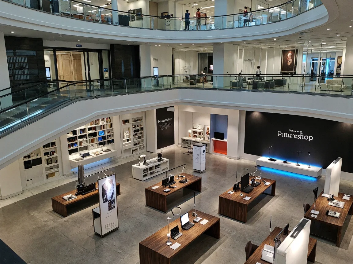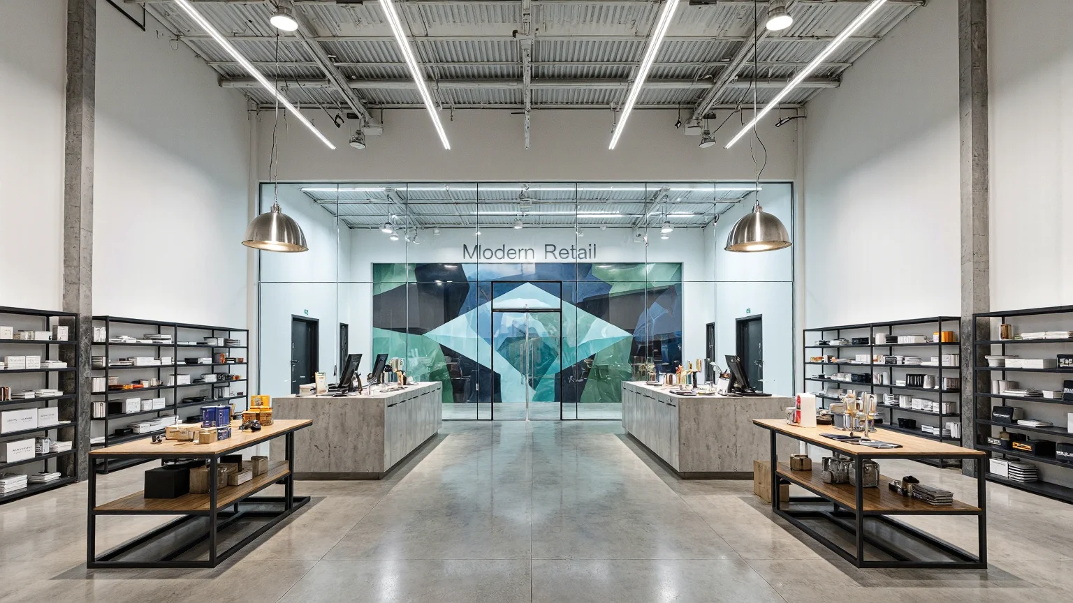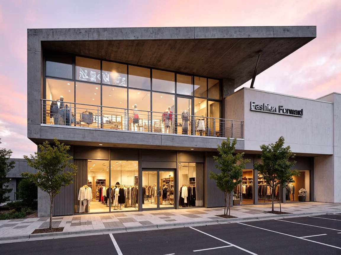 Modern retail store exterior at dawn with architectural details, two-story rectangular prism of concrete and glass, clean matte finish in white and light gray, warm morning light, stylish clothes inside, 'Fashion Forward' sign.
