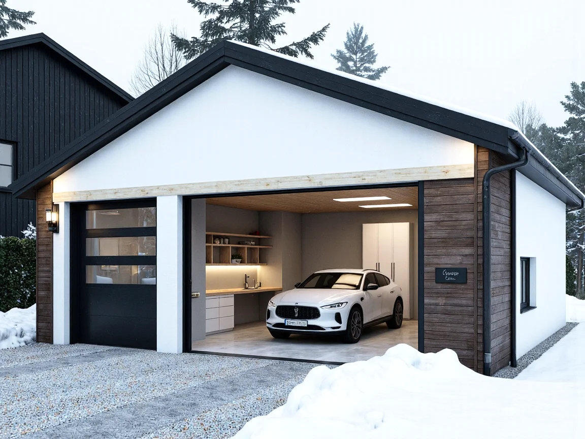 Scandinavian style garage in winter, white stucco exterior with dark wood accents, large black metal framed windows, snowy roof, modern design, warm outdoor sconce, neat gravel driveway, simple interior with polished concrete floors, minimalistic workbench, two cars parked inside.