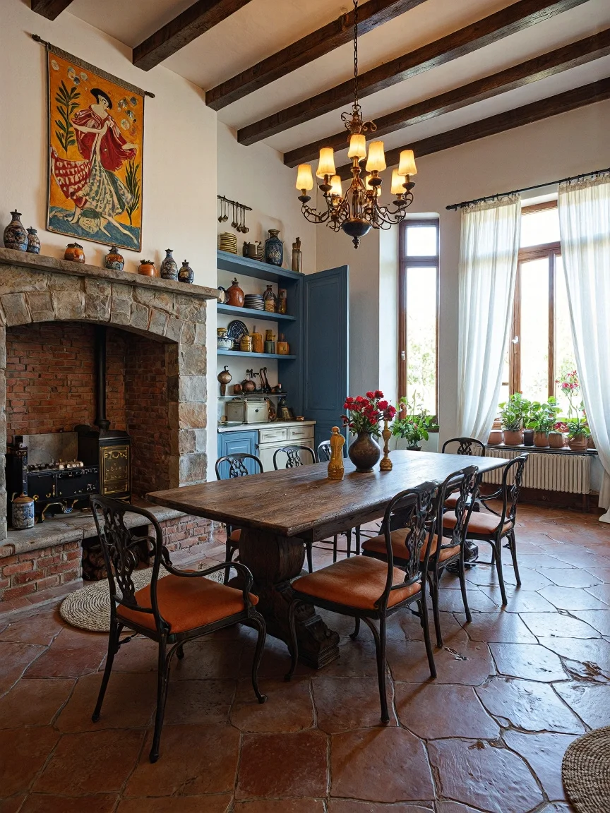 Rustic Spanish kitchen with dark oak table, wrought iron chairs, antique chandelier, terracotta open shelf, ceramic crockery, tapestry of flamenco dancer, stone hearth with stove, wooden cupboard, bay window with plants, Saltillo tile floor, jute rugs.
