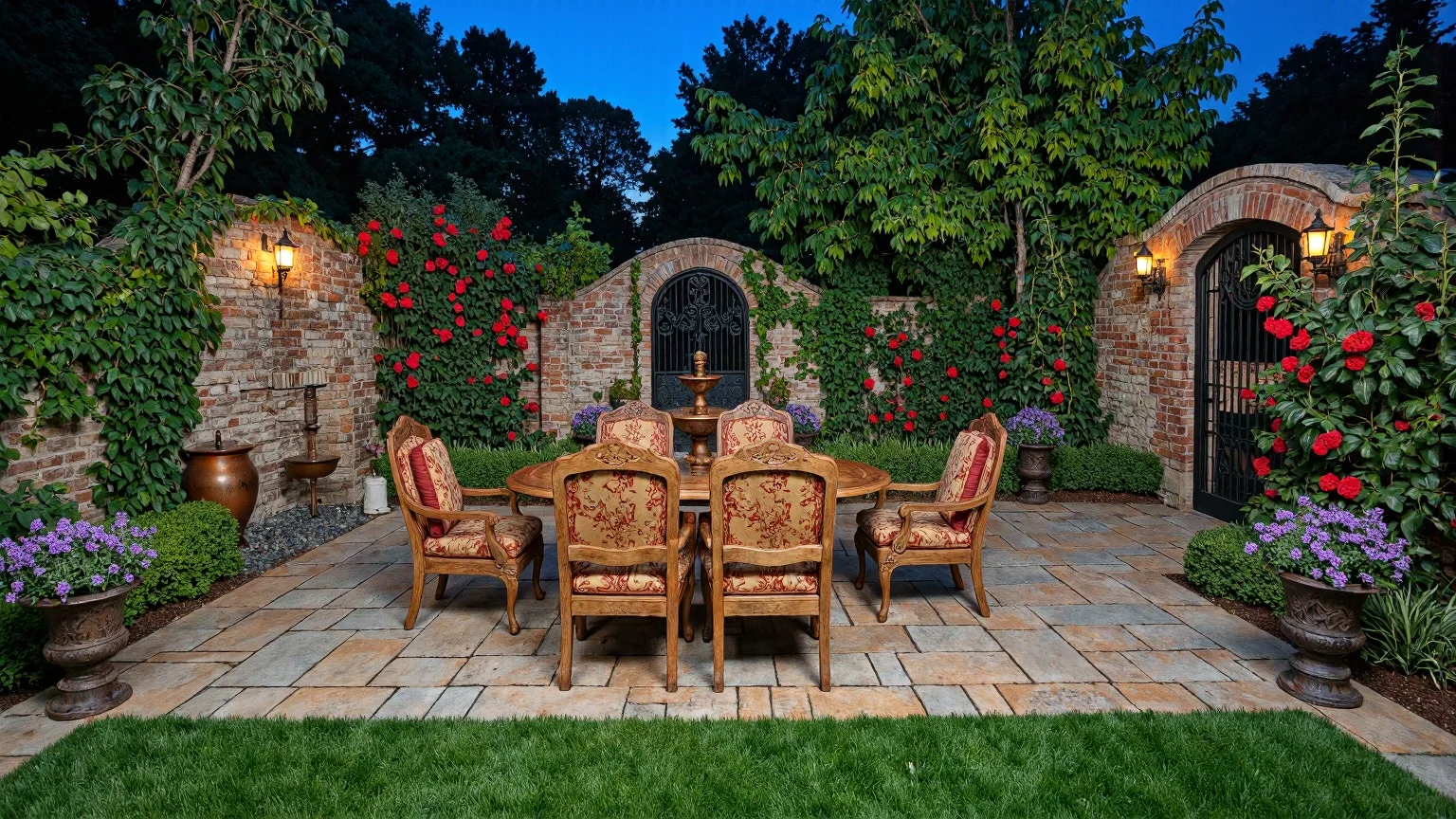 A traditional patio in a lush garden with antique cobblestone paving, a teakwood table, vintage chairs with floral cushions, an English-style brick fireplace, a copper fountain, and rose bushes under a clear evening sky.