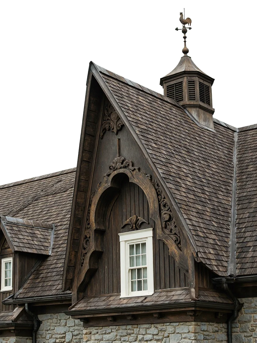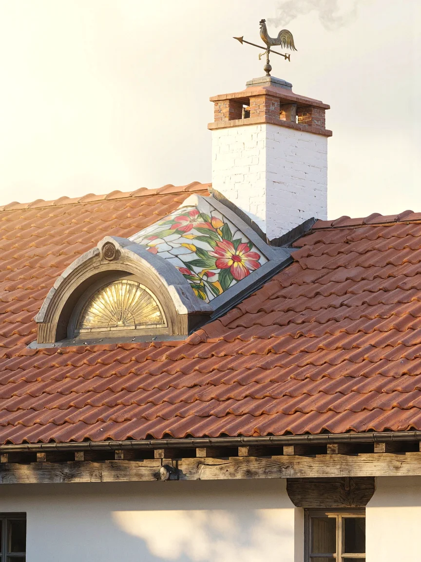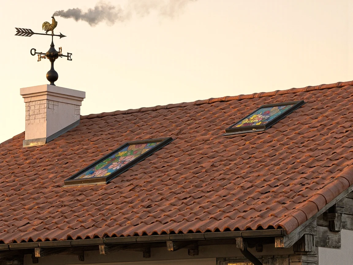 Traditional Mediterranean rooftop design with terra-cotta tiles, a white chimney, rustic wooden beams, a wrought-iron weather vane, and a vintage stained glass skylight, under warm golden sunrise or sunset lighting.