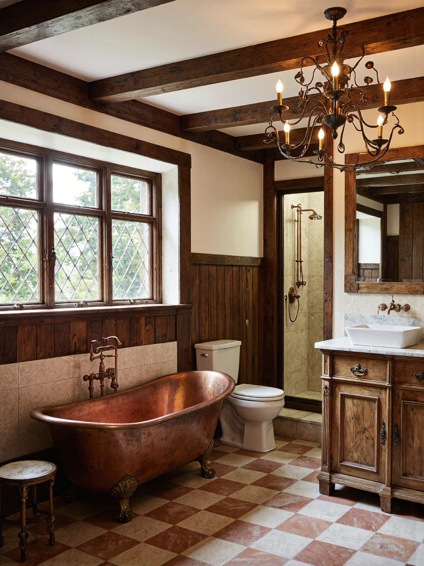 Tudor-style guest bathroom featuring a freestanding copper bathtub, oak vanity, marble sink, high cistern toilet, and enclosed shower area with copper fixtures, set against creamy plaster walls and a checkerboard floor.