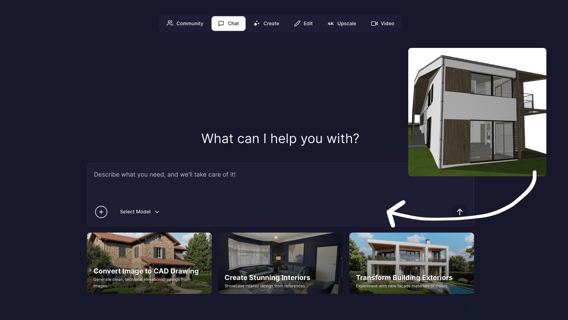 Con Rendair AI puoi creare, modificare e correggere i visuali degli edifici. Passa da blocchi a render finali.