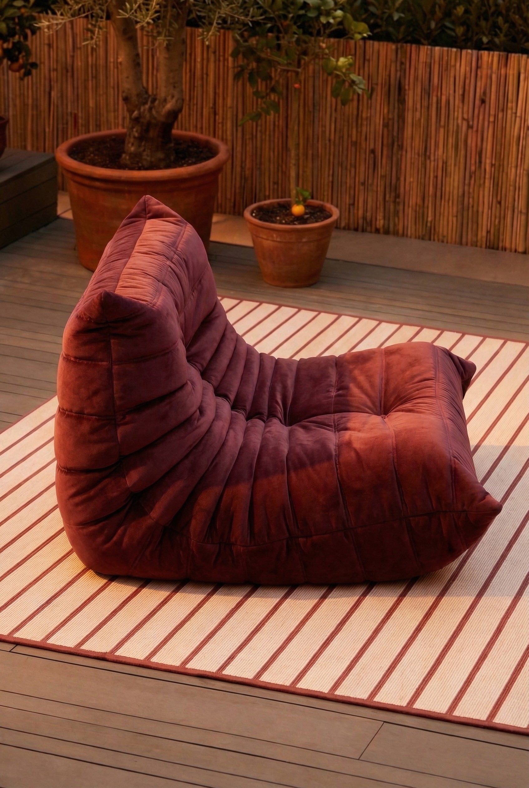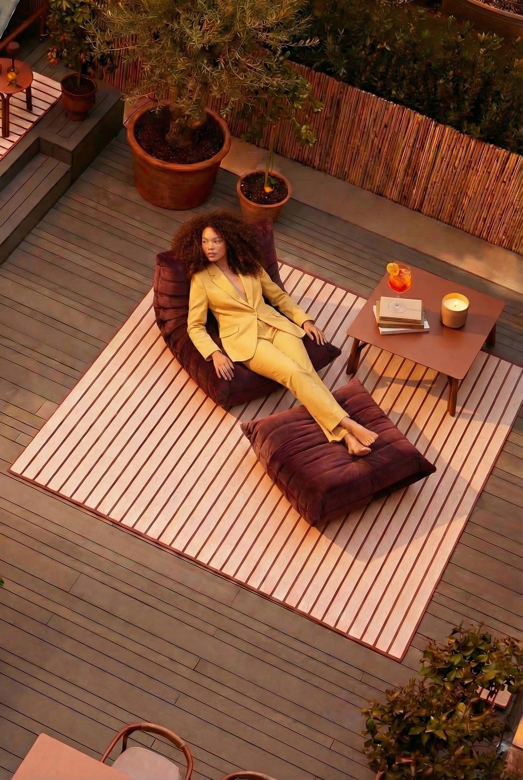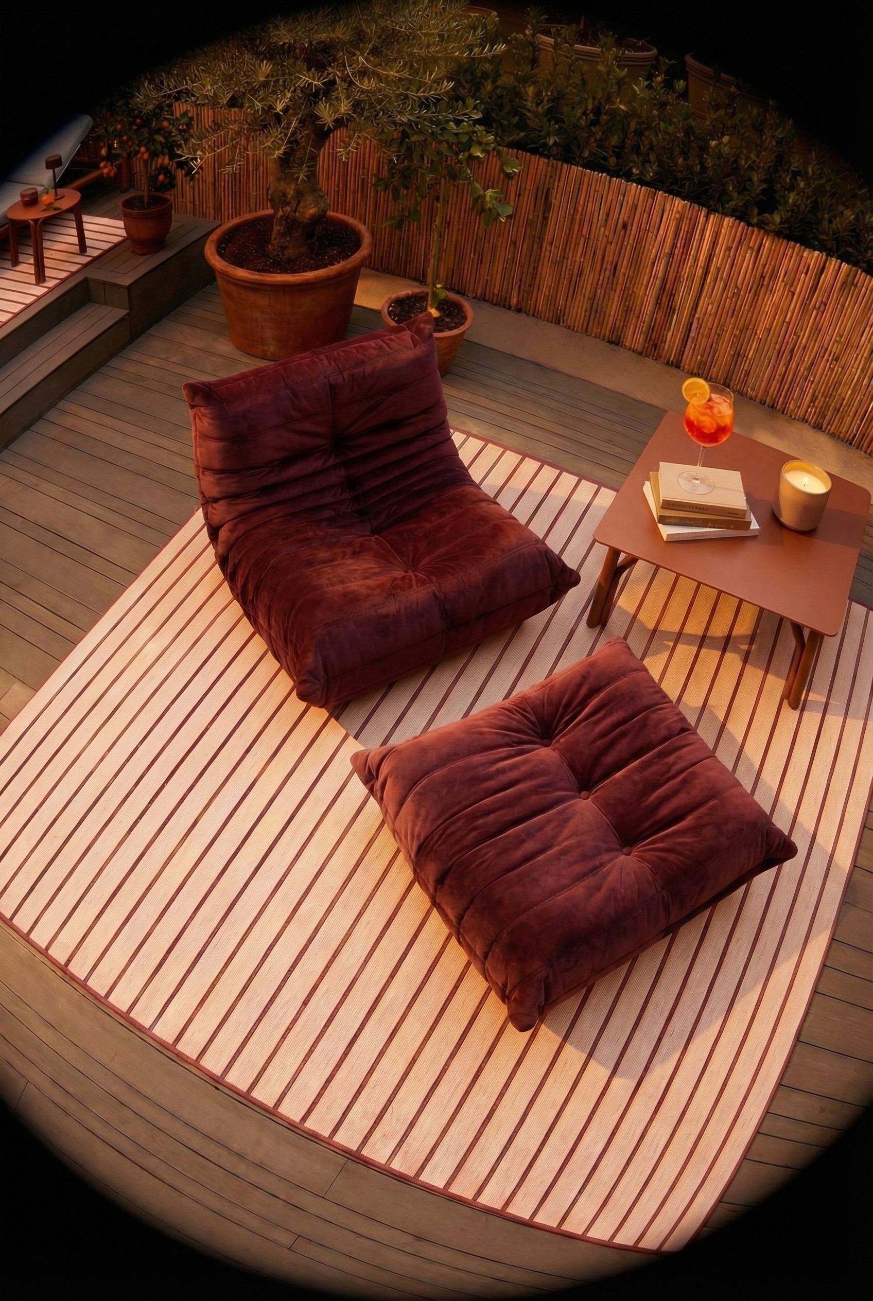 Posiziona questa poltrona su un terrazzo di legno esterno con illuminazione calda, piante attorno allo spazio e un'atmosfera di lifestyle rilassata.