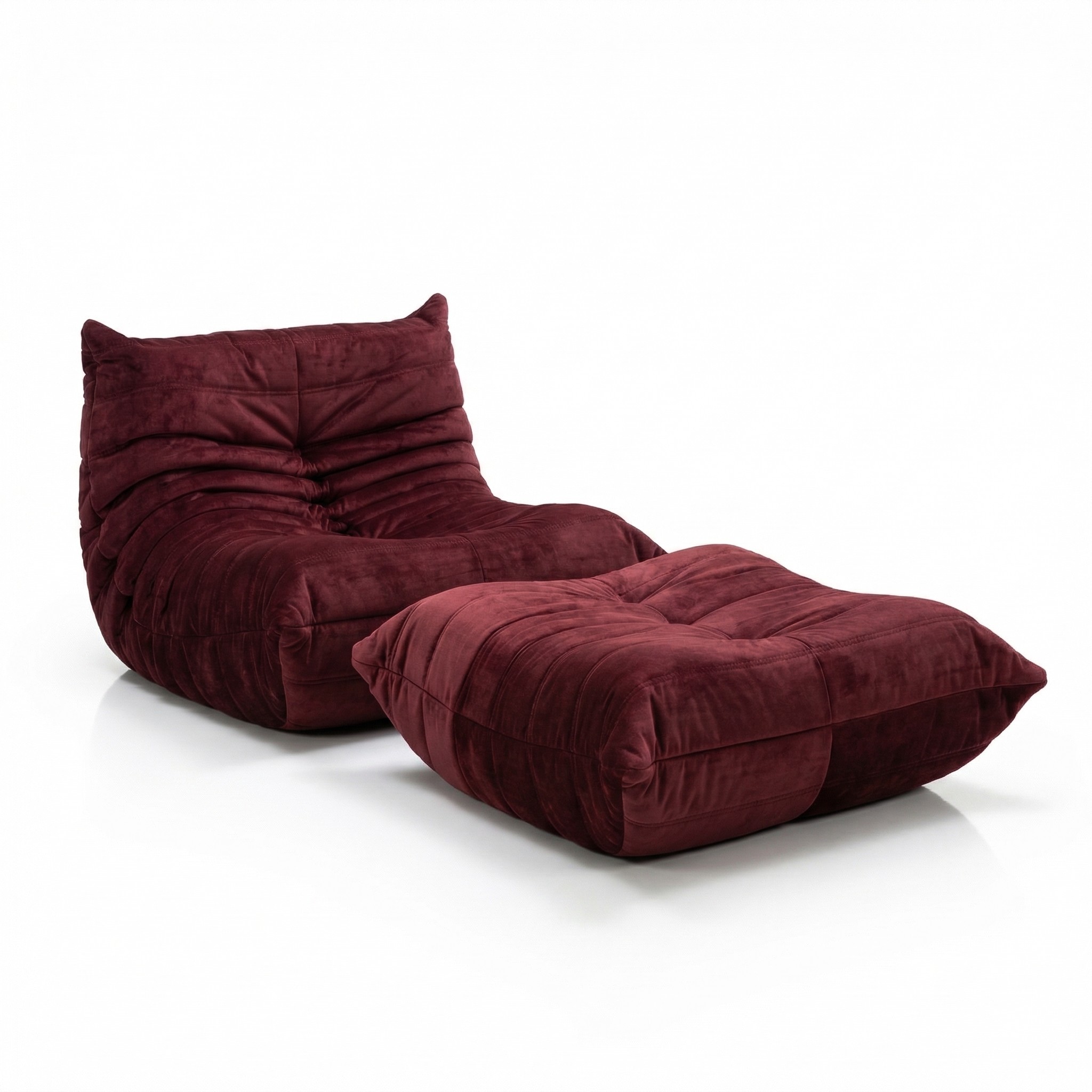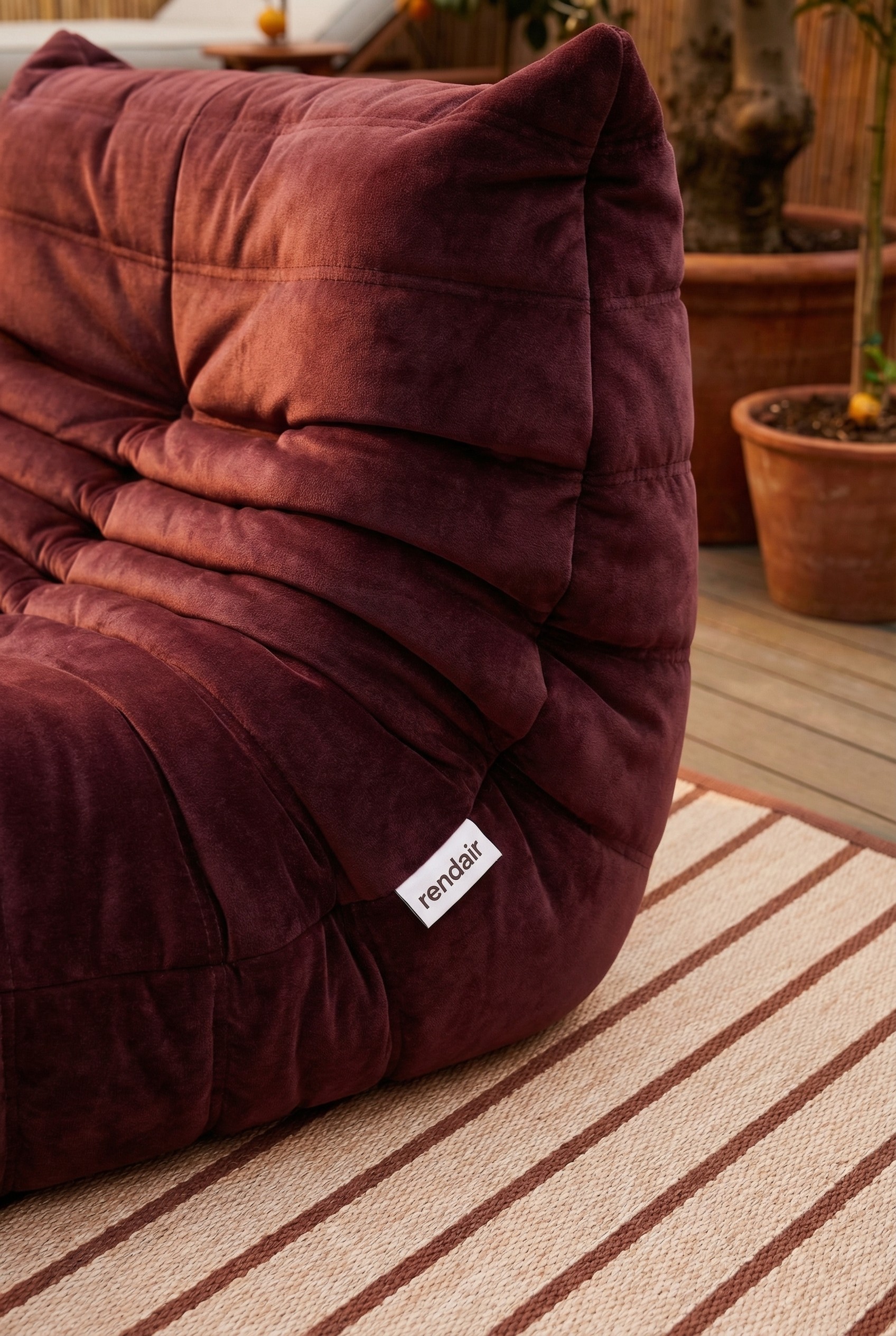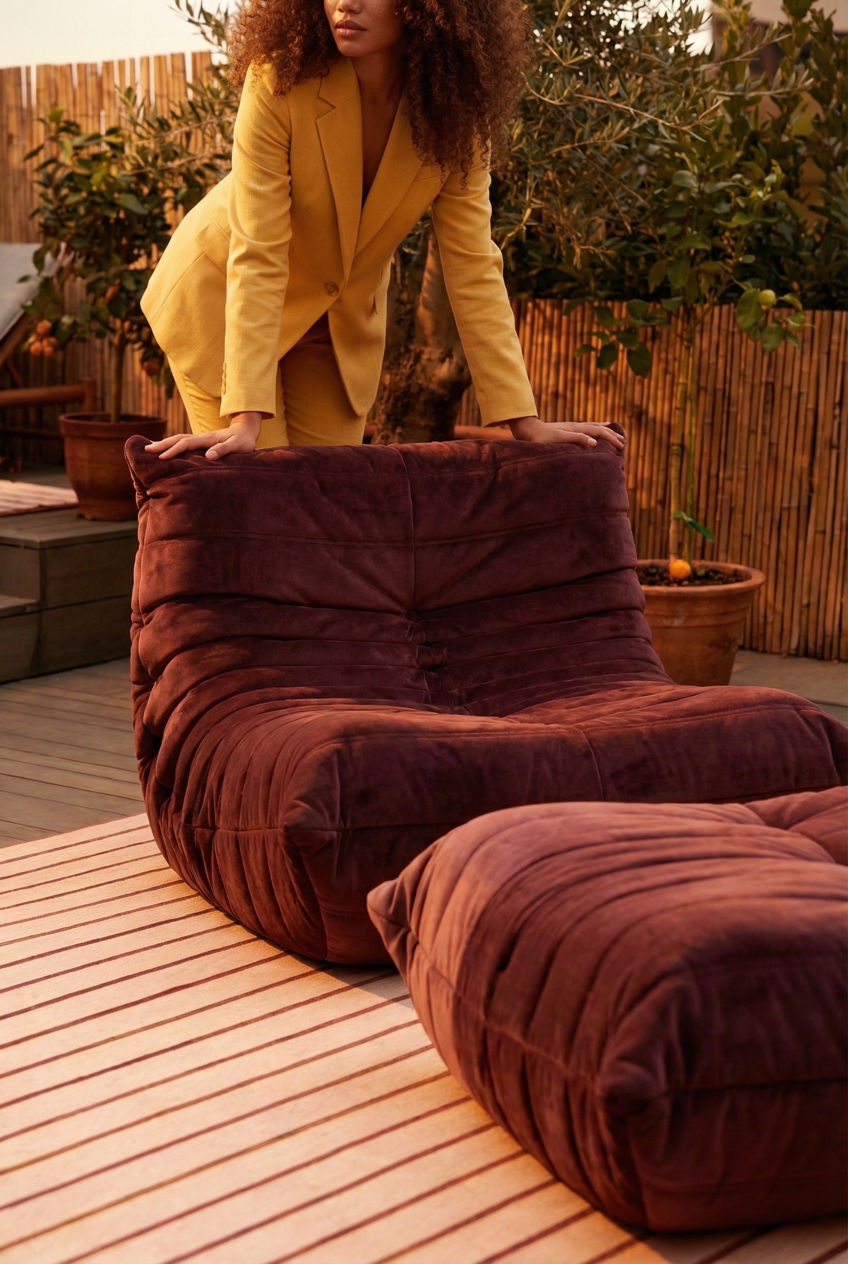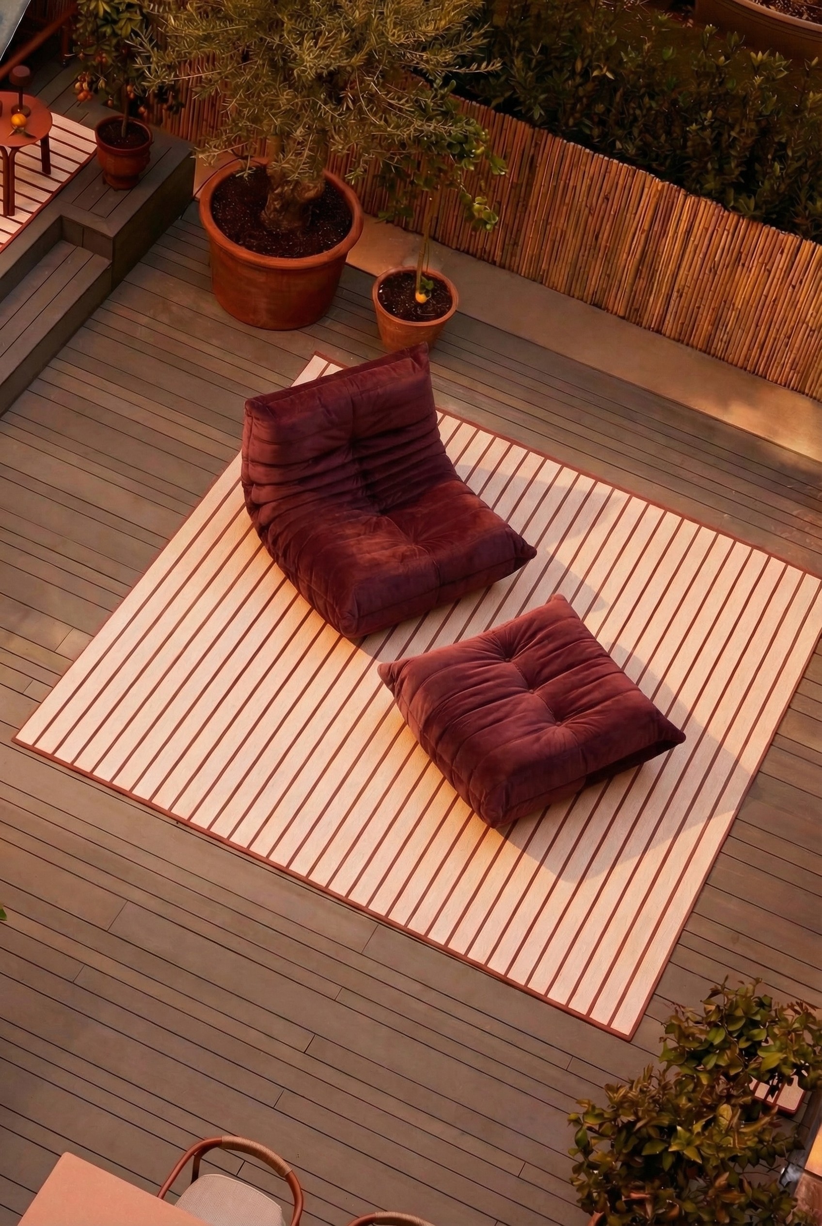 Posiziona questa poltrona su un terrazzo di legno esterno con illuminazione calda, piante attorno allo spazio e un'atmosfera di lifestyle rilassata.