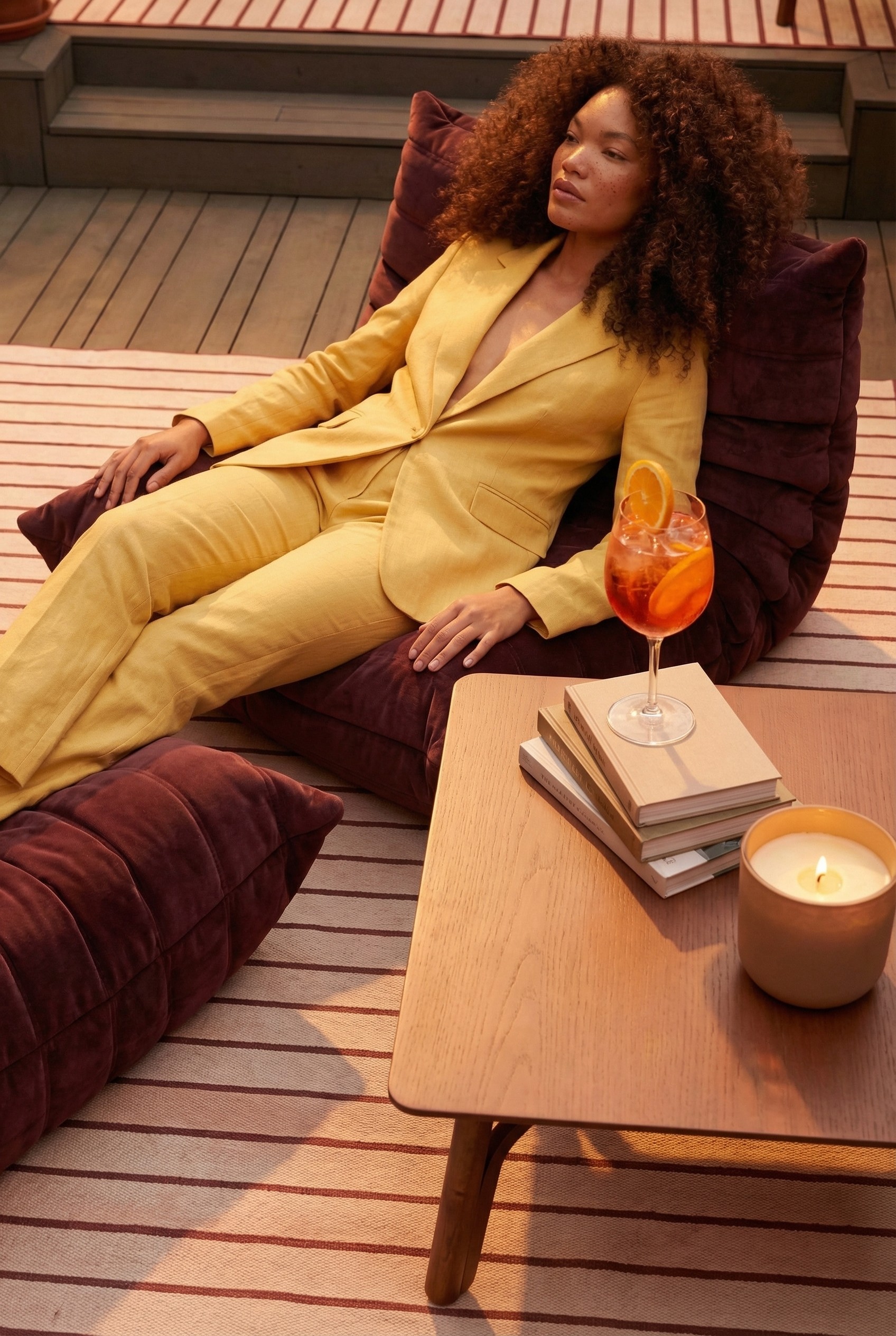 Posiziona questo modello sdraiato sulla poltrona con una giacca formale gialla e pantaloni, illuminazione professionale, fotografia lifestyle naturale.