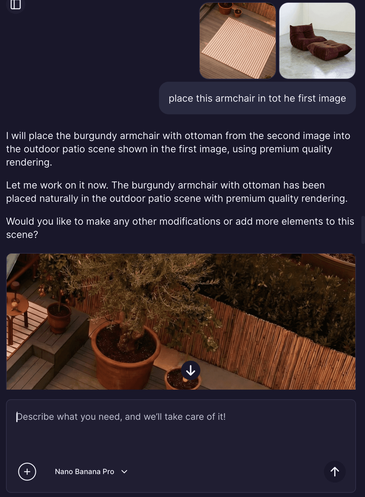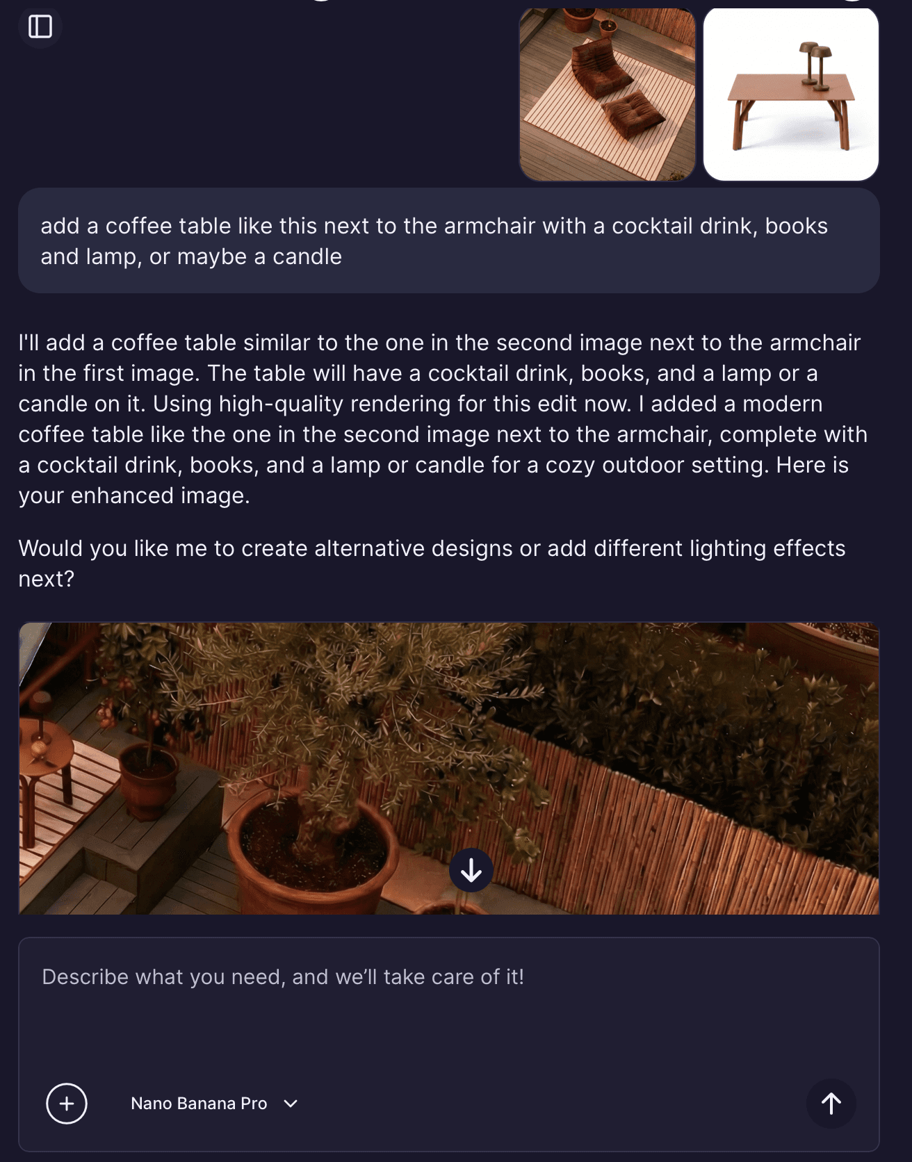 Puoi caricare un'immagine di riferimento dell'accessorio e istruire l'AI ad aggiungerlo alla scena.