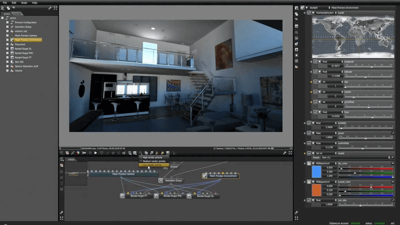 Enscape è probabilmente lo strumento di rendering più facile sul mercato. Le sue impostazioni sono semplificate in slider (ad esempio, "Densità delle nuvole", "Ora del giorno"), rendendolo accessibile a chiunque. Octane Render, al contrario, presenta una curva di apprendimento ripida. Usa un editor basato su nodi per i materiali, che è potente ma può intimorire i principianti. Configurare l’illuminazione e ottimizzare le impostazioni di rendering in Octane richiede una solida comprensione dei principi del rendering 3D.