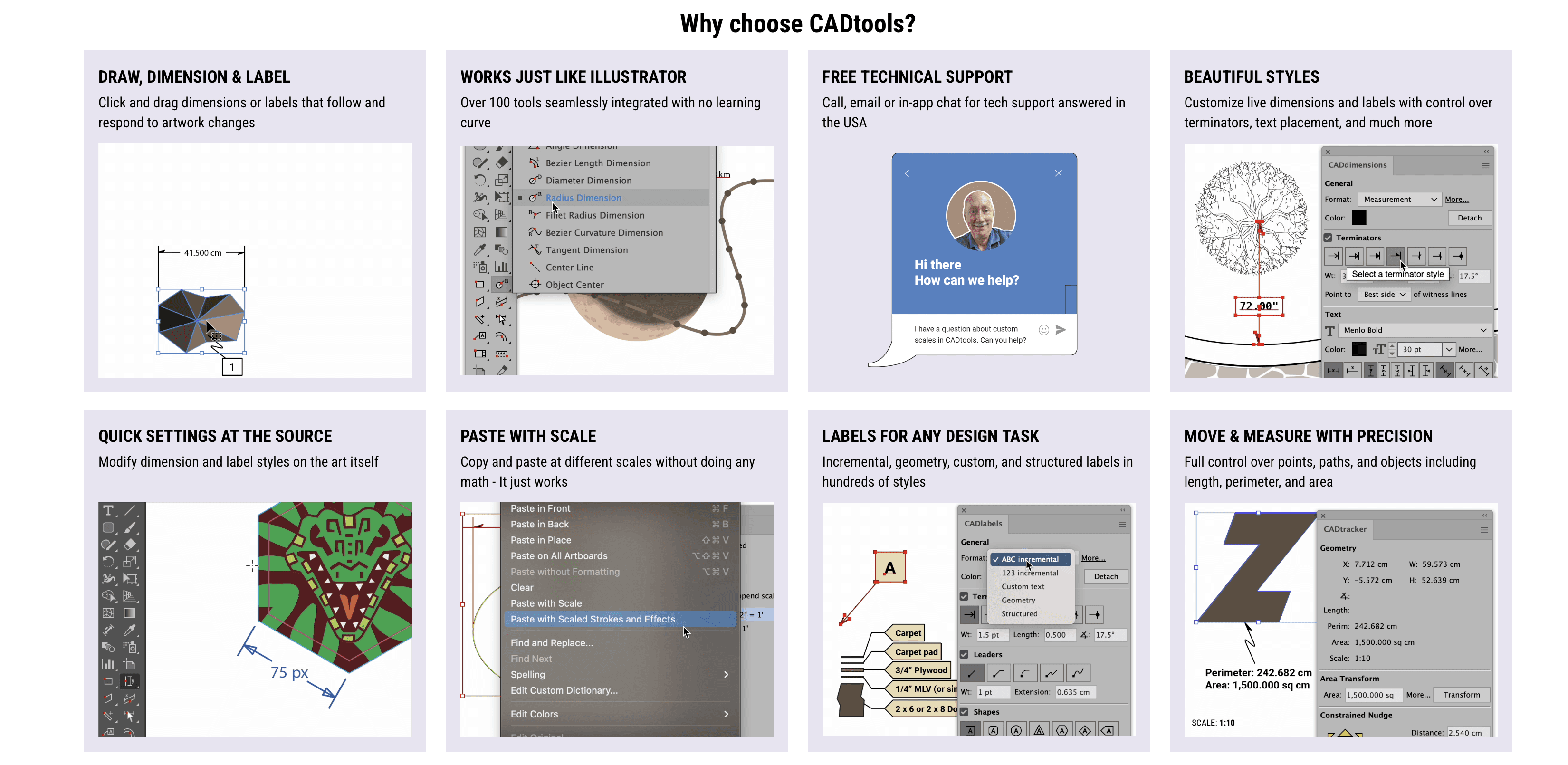 Why it matters: Illustrator does not understand architectural scale by default. CADtools lets you draw in scale (e.g., 1:50 or 1/4" = 1') and automatically updates dimension text if you resize an object.