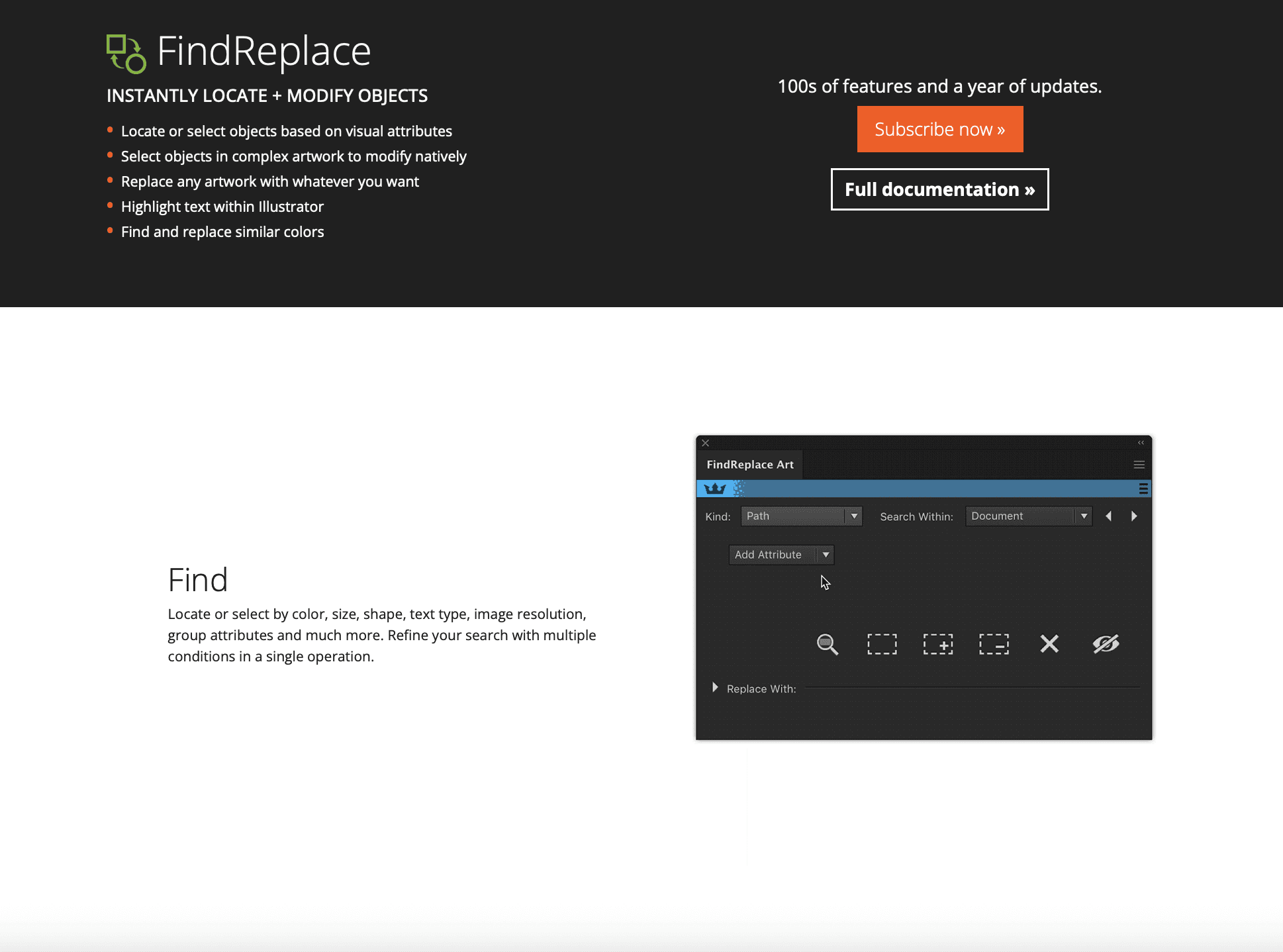 A simple but critical tool for large documentation sets. It allows you to find and replace specific objects, colors, or text strings across an entire document or multiple artboards.