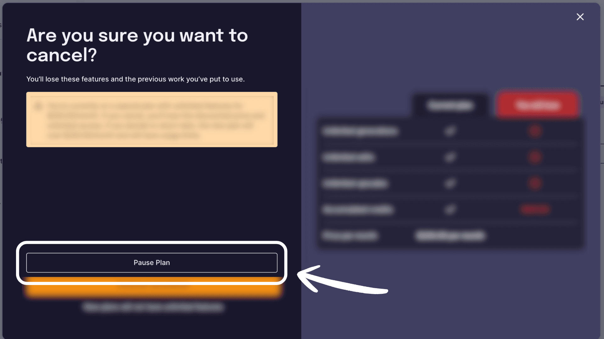 Cancellation warning: If you choose to cancel instead of pause, be aware that unused credits are lost immediately upon cancellation. Pausing is the safer option if you intend to return.
