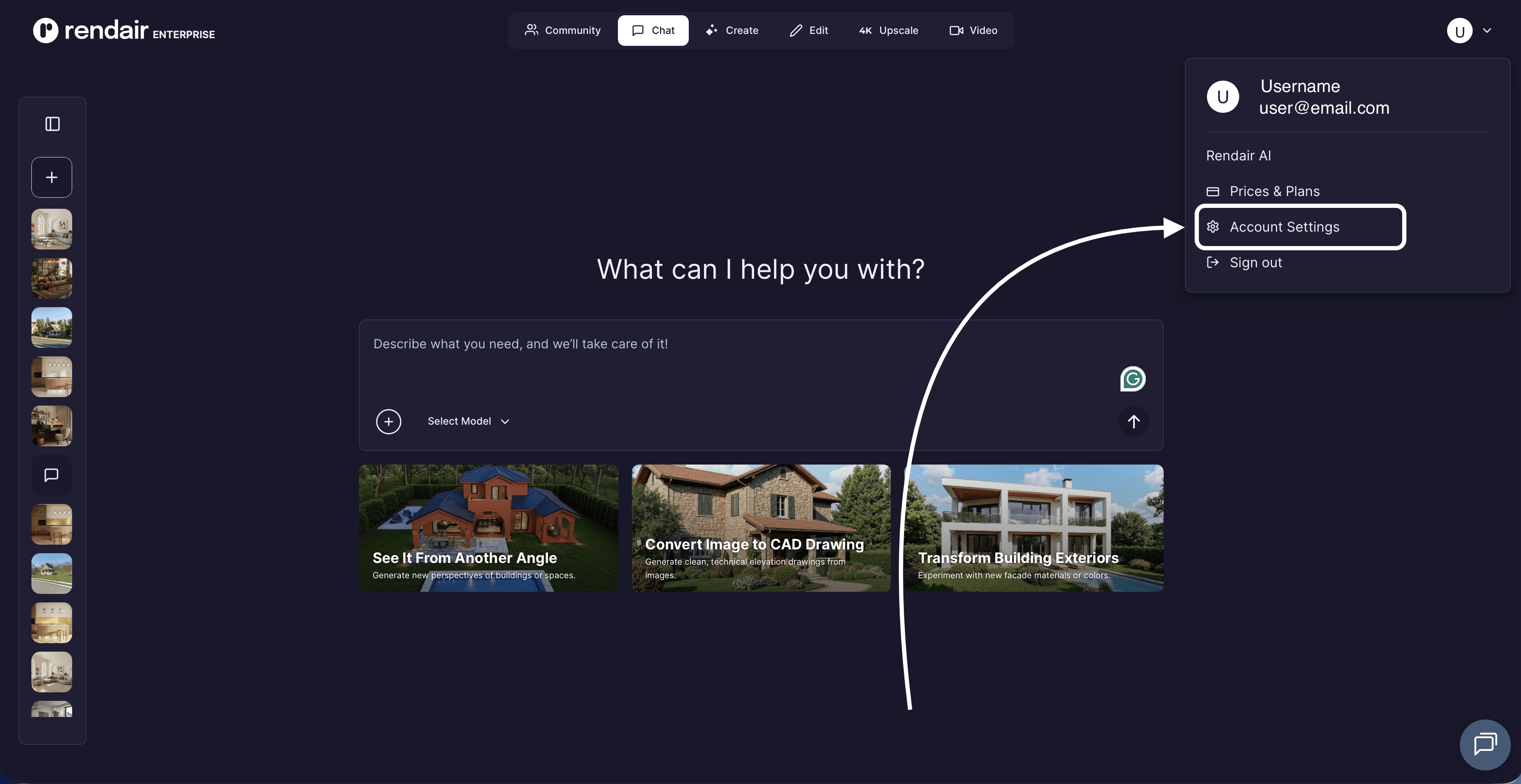 Access Settings: Log in to your Rendair AI account and navigate to your Account Settings.