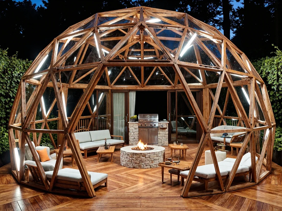 Una piattaforma circolare di 25 piedi di diametro progettata come una cupola geodetica con legno di mogano lucidato, divani bassi e un focolare. Struttura interna visibile, pannelli di vetro semi-trasparenti, luci LED, piccolo angolo cottura e vasi con edera.