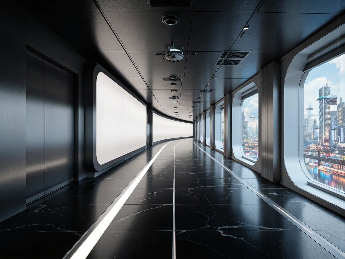 Corridoio futuristico con parete LED che emette una luce bianca soffusa, grandi finestre ovali che mostrano un paesaggio urbano AI, pavimento in ossidiana lucida, linea guida luminosa, soffitto con pannelli neri e droni fluttuanti, porte a doppio battente in acciaio spazzolato.