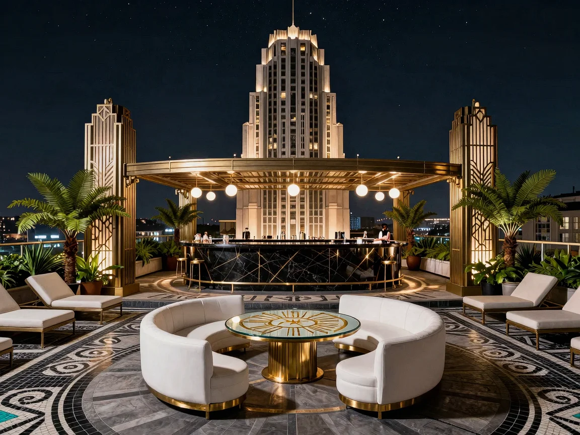 Grand Art Deco tetto con area salotto circolare, sedute imbottite bianche con rifiniture dorate, bar in marmo nero lucido, griglie geometriche ornate, vegetazione lussureggiante, iconica struttura a zigurrat, tetto in piastrelle grigio carbone, piscina in mosaico bianco e nero e un cielo notturno stellato.