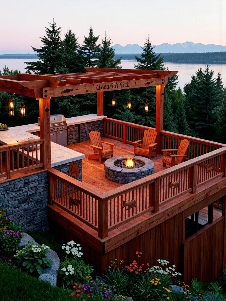Deck in stile regionalista nel Canada settentrionale con cedro rosso rustico, ringhiere intagliate, focolare circolare in pietra, sedie Adirondack, cucina all'aperto e una pergola con lanterne, affacciata su un lago tranquillo e montagne coperte di pini.
