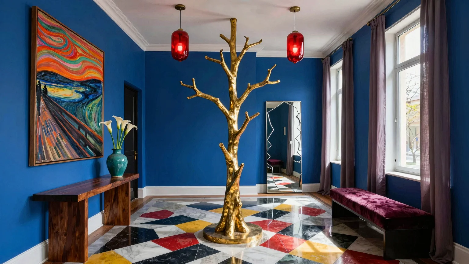 Ingresso espressionista con un attaccapanni scultoreo che assomiglia a un albero, parete blu cobalto, panca in velluto prugna, pavimento in piastrelle geometriche audaci, grande specchio rotondo e luce naturale proveniente da ampie finestre.