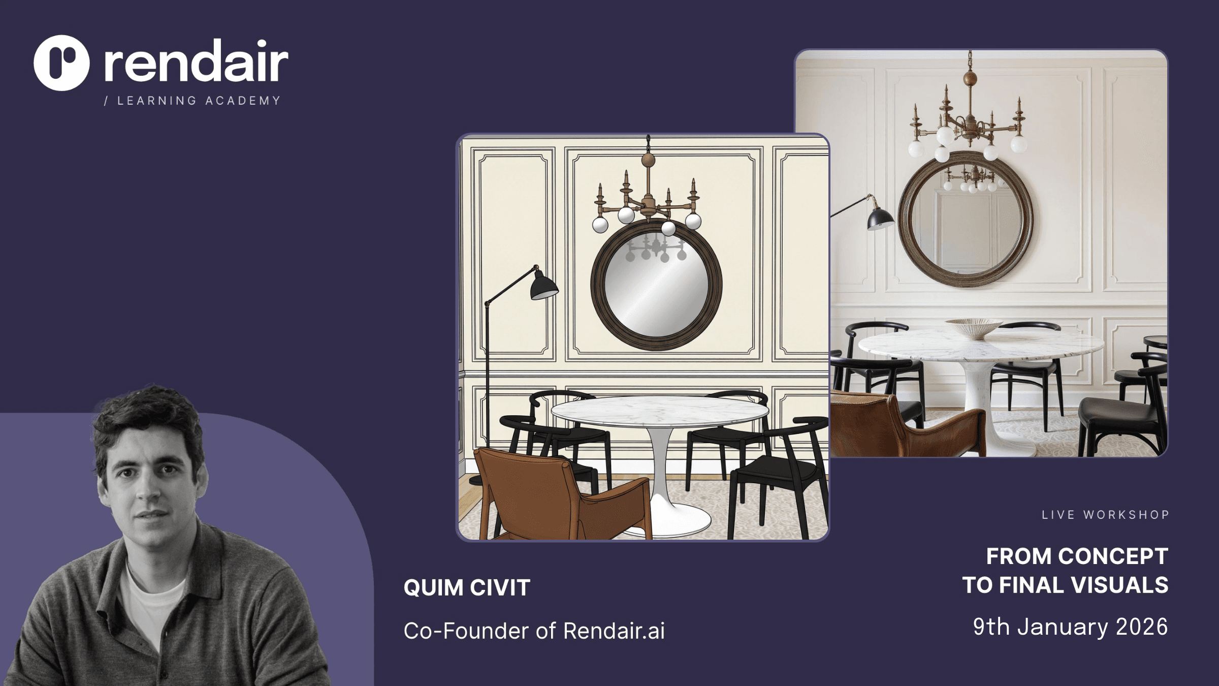 You will learn how to integrate AI into your design process, work faster, communicate ideas more clearly, and stay confident and up to date with the latest tools. We will apply everything directly inside Rendair so you can improve the way you work the very next day.