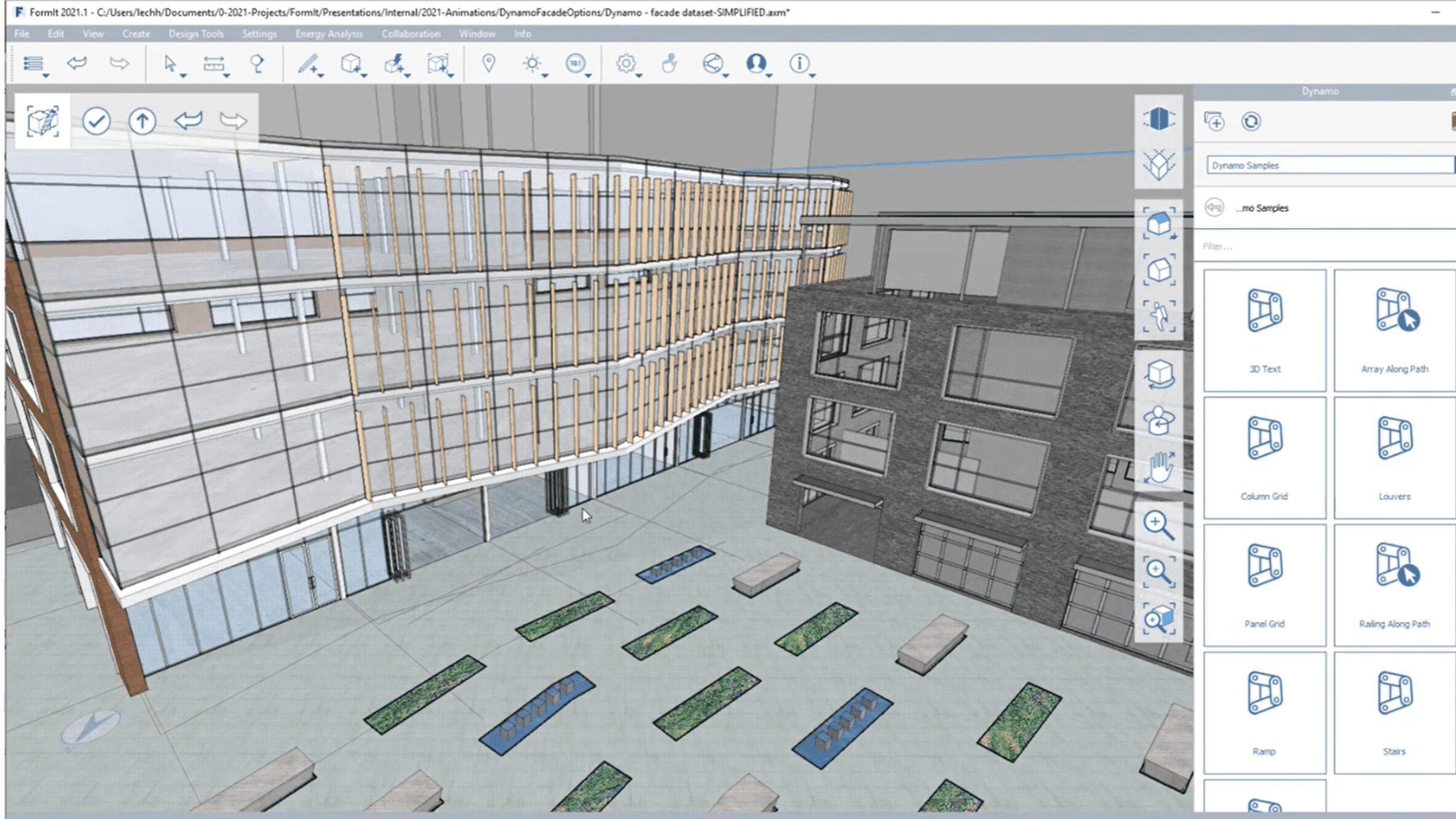 Dynamo isn't just a plugin; it is natively integrated into FormIt. However, it functions as an extension engine that allows you to run complex scripts, like placing trees along a path or generating louvers, without opening a separate window.