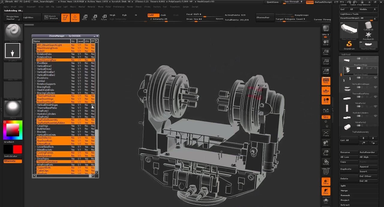 Por que é importante: Cenas arquitetônicas geralmente contêm centenas de partes. A lista nativa do ZBrush é linear e inadministrável. O ZSceneManager permite agrupar objetos, renomeá-los em lote e alternar a visibilidade de "pastas" inteiras de uma vez.