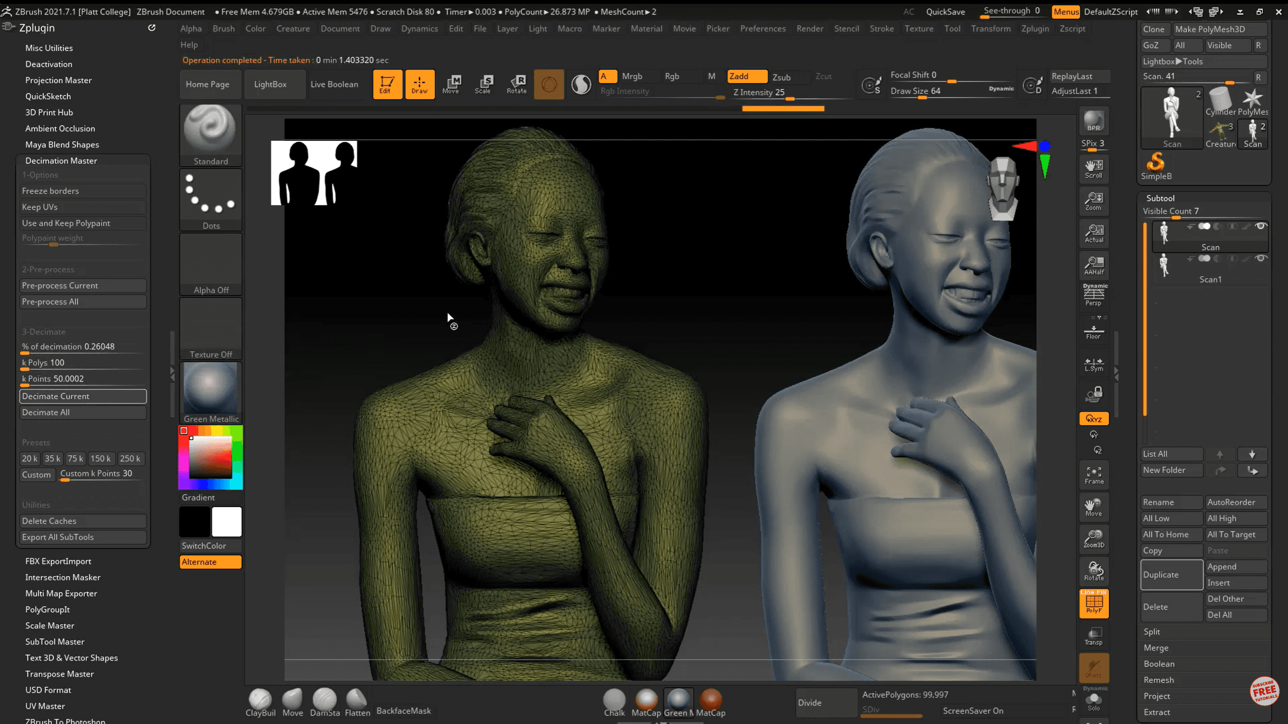 Por que é importante: Uma coluna de 20 milhões de polígonos vai travar seu software de renderização. O Decimation Master reduz inteligentemente a contagem de polígonos em até 90% enquanto mantém os detalhes de borda e superfície intactos. É essencial para mover o trabalho para fora do ZBrush.