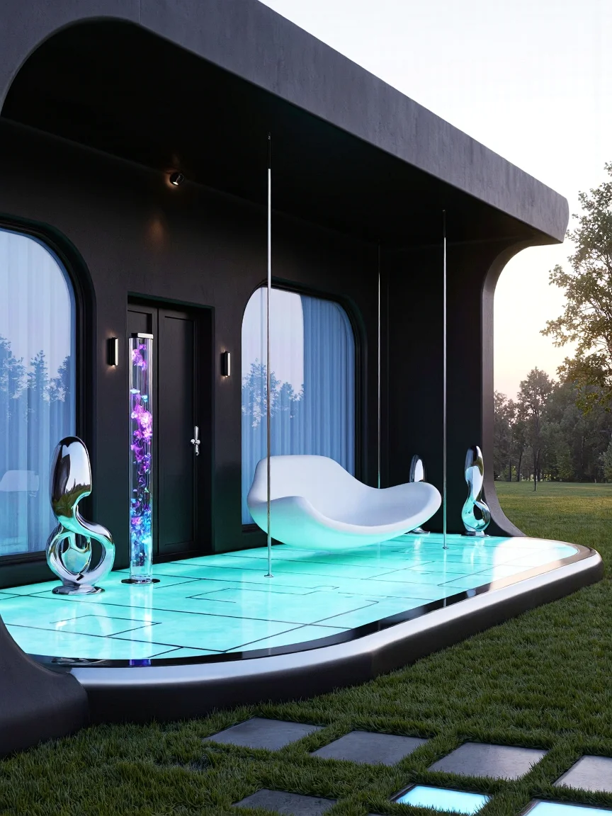 Alpendre futurista ao amanhecer com materiais pretos mate elegantes, janelas panorâmicas com tom azul, azulejos cianos brilhantes, esculturas metálicas abstratas, cadeira de balanço antigravidade, sistema de plantas inteligentes com plantas bioluminescentes e pedras de passo luminiscentes.
