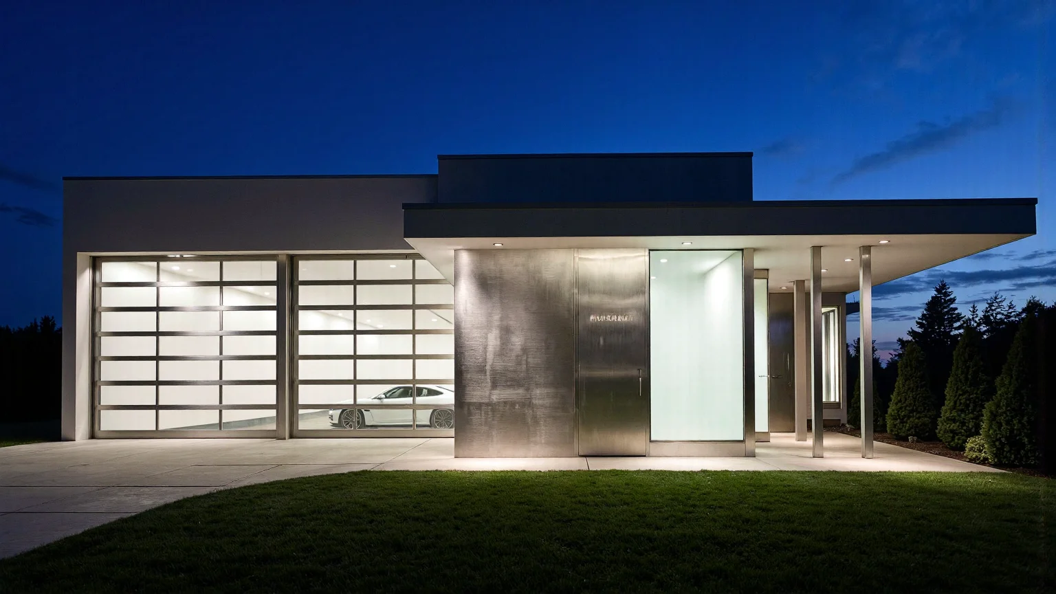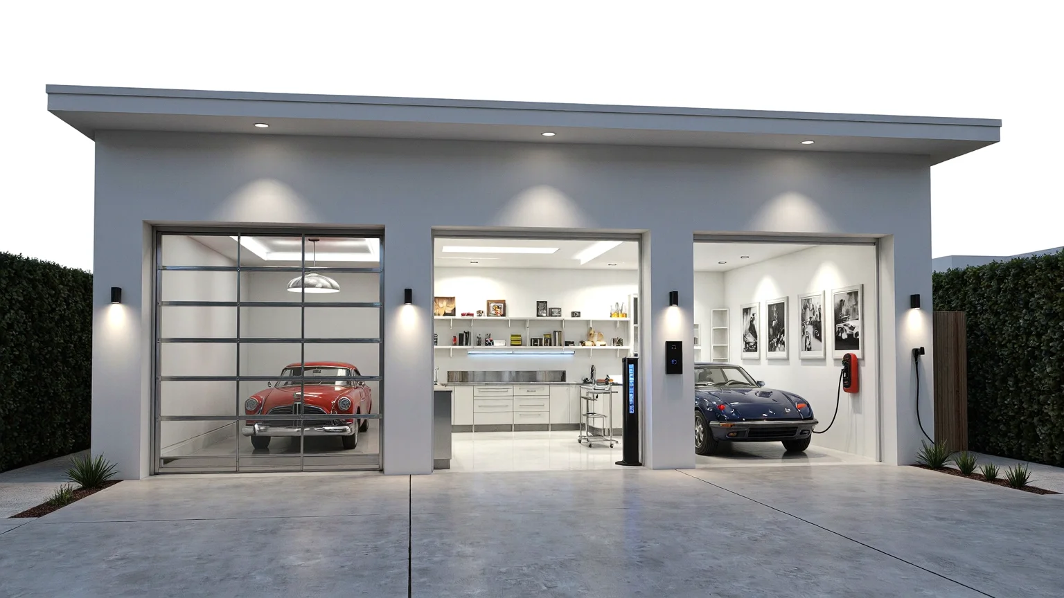 Garagem em Estilo Internacional com exterior branco, três grandes portas de vidro deslizantes, carro vintage vermelho, ferramentas organizadas, piso de concreto polido, bancada em aço inoxidável, estação de carregamento elétrico, paisagismo minimalista.