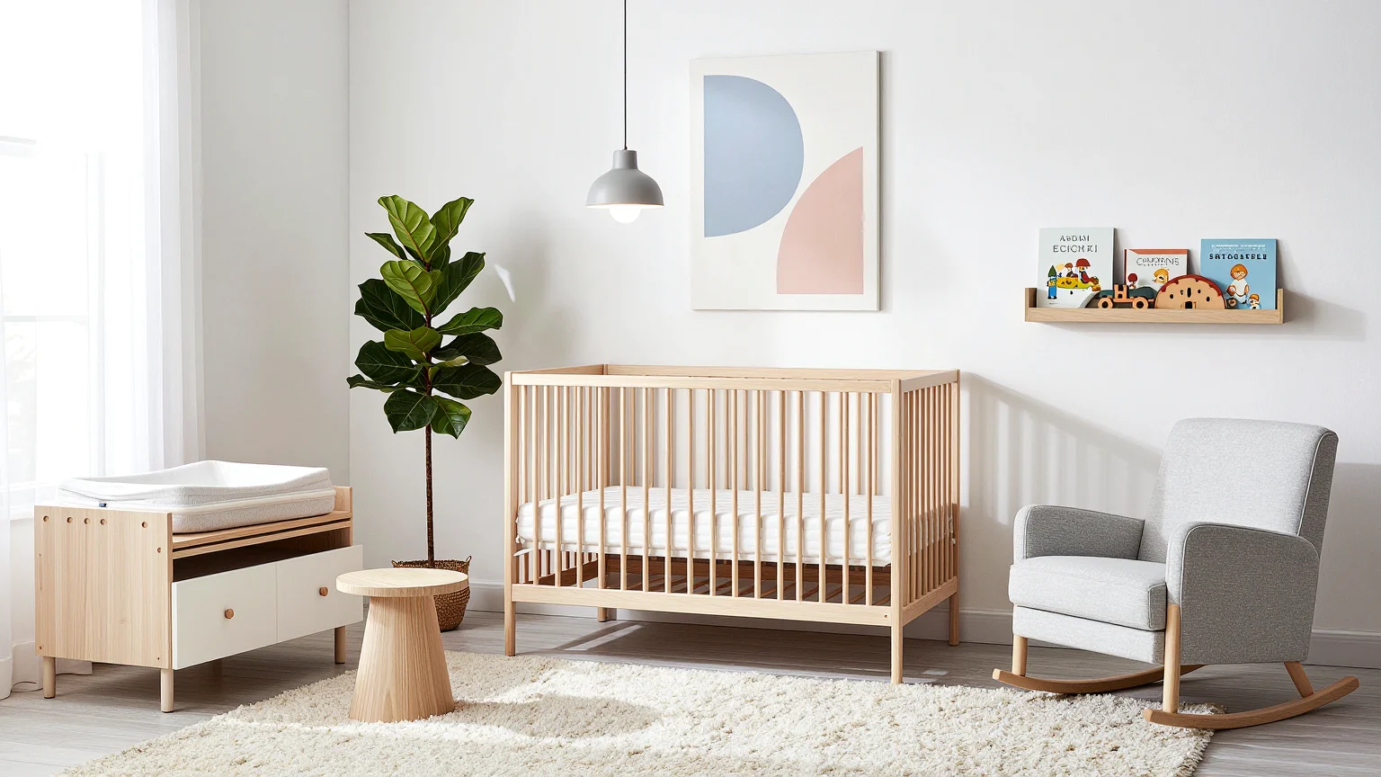 Um quarto de bebé escandinavo minimalista com uma palete de cores brancas, apresentando um berço de madeira de bétula, uma estação de mudança montada na parede, uma cadeira de baloiço em cinza claro, uma mesa lateral circular, arte em tela abstrata e um canto com prateleiras e uma figueira-lira.