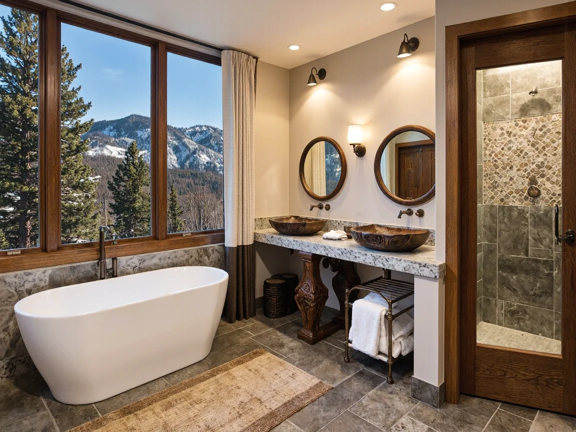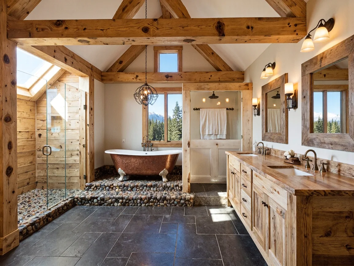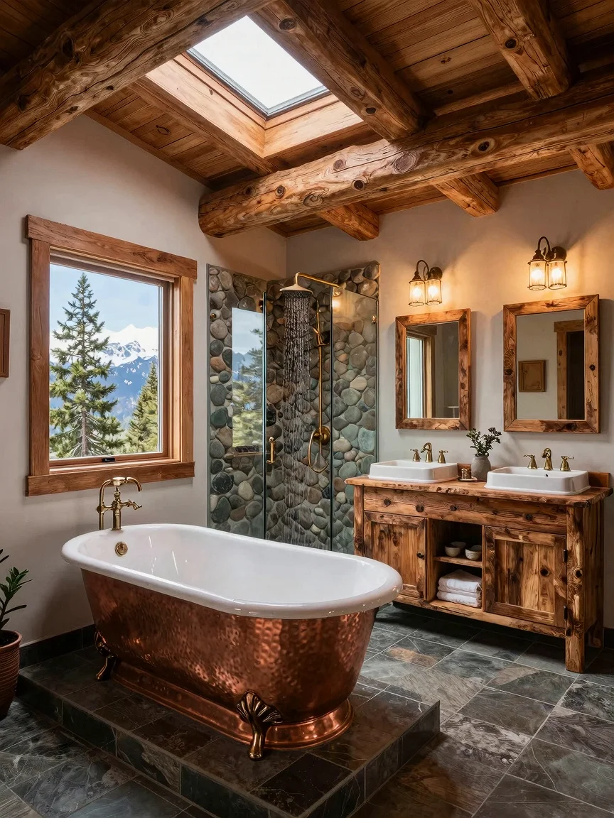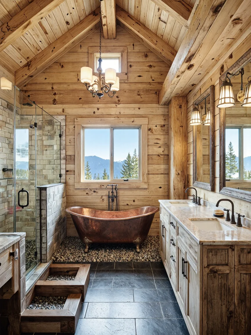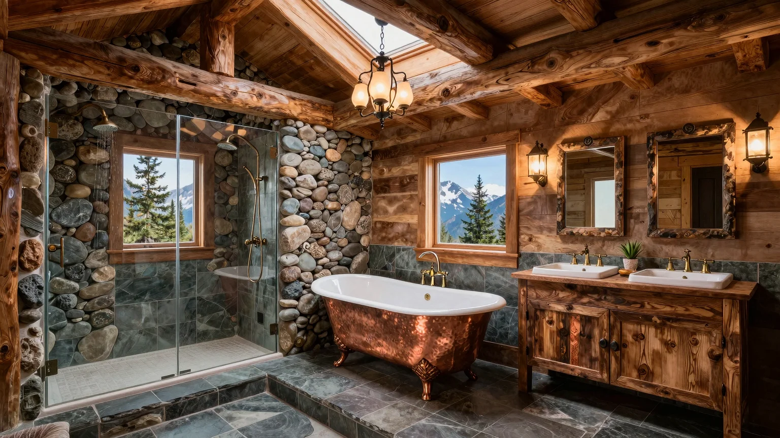 Mountain lodge bathroom with oak beams, clawfoot copper bathtub on slate tiles, river rock shower, reclaimed barn wood vanity, vintage brass faucets, rustic chandelier, and nature views.