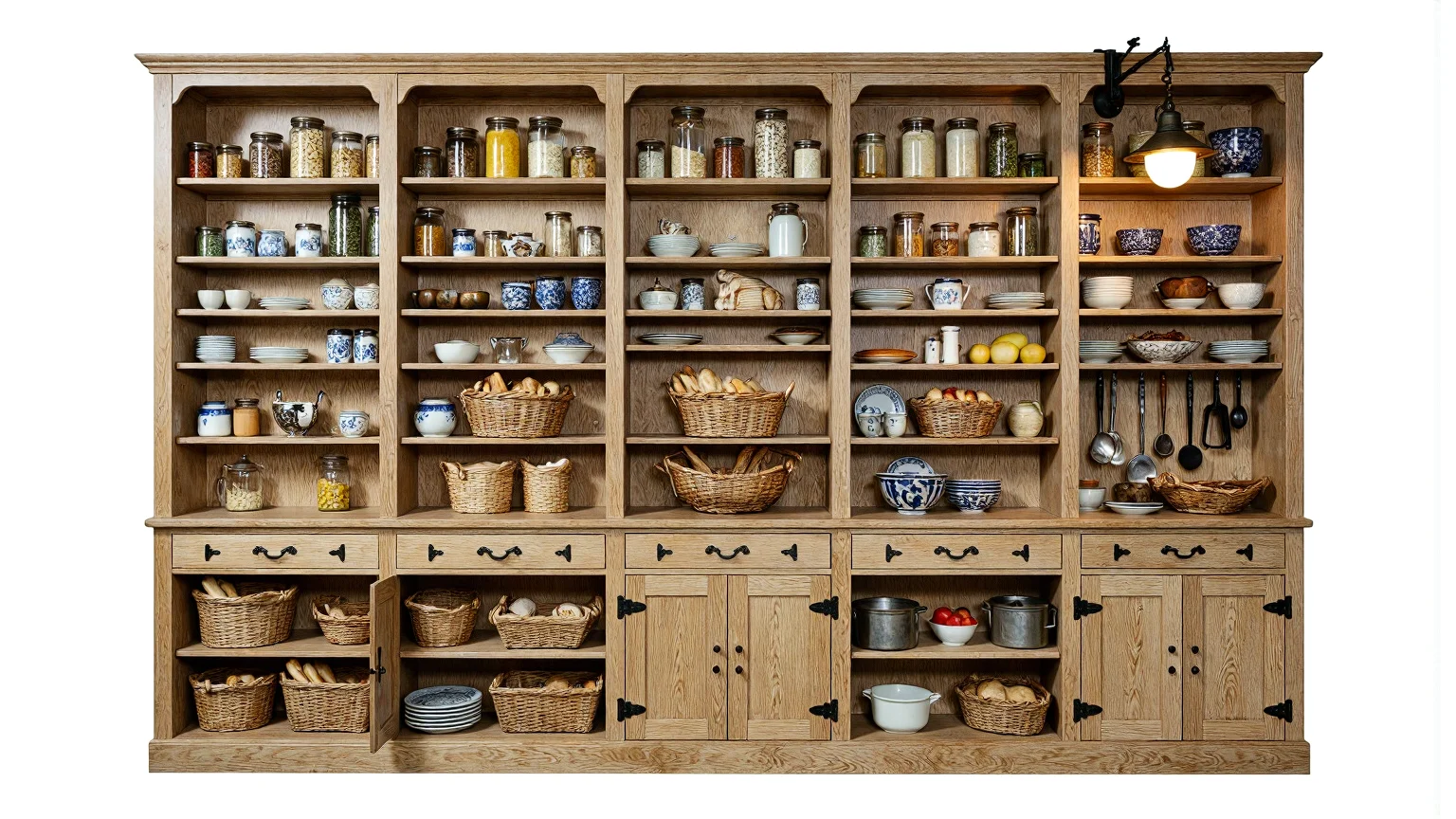 Uma despensa vernacular estilizada após uma casa de campo francesa, com estrutura de carvalho envelhecido, prateleiras abertas com frascos de vidro, cestos de vime e um armário rústico de carvalho com portas duplas.