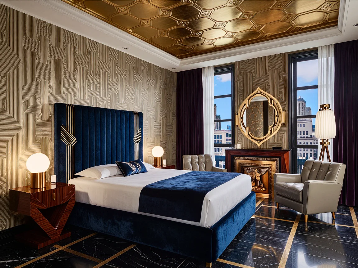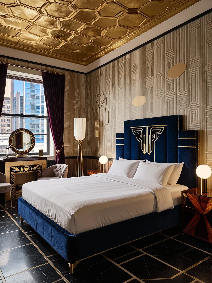 Luxurious Art Deco bedroom with geometric wallpaper in gold, cream, and charcoal. King-sized bed with velvet midnight blue headboard, polished black marble floor, angular mahogany bedside tables, vintage glass lamps, large vanity unit, elegant fireplace with club chairs, rich plum velvet drapes, and a floor lamp with pearl-white shade.
