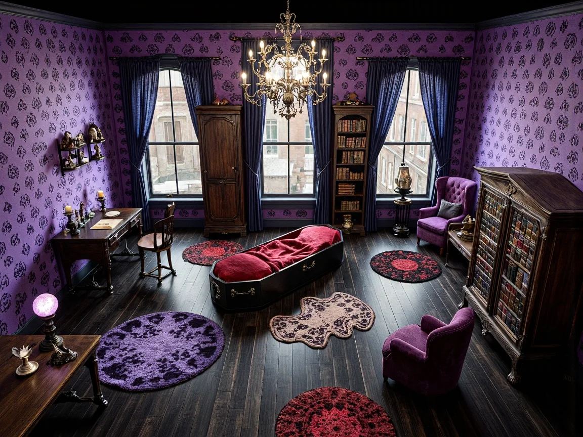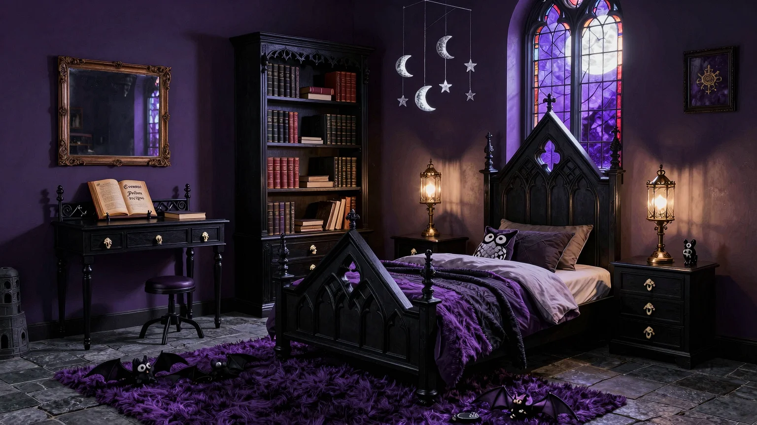 A gothic kids bedroom with purple walls, black ornate designs, dark hardwood floor, coffin-shaped black mahogany bed with red velvet bedding, wrought-iron bedside table with a crystal ball lamp, dark wooden armoire with bat-wing handles, dark wood desk with a quill and books, shelves with gargoyles and candlesticks, tall arched windows with midnight blue curtains, tarnished silver chandelier, and a purple reading nook chair filled with ghost stories.