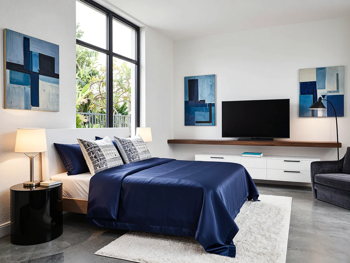 Modern bedroom with a king-size bed in midnight blue satin linens, geometric patterned throw pillows, white oak headboard, cylindrical nightstands with black quartz surfaces, silver lamp, open book, dark walnut floating shelf with flat-screen TV, white low-profile dresser, grey concrete floor, white plaster walls, floor-to-ceiling windows, abstract paintings in blue tones, charcoal armchair with velvet upholstery, shaggy white rug, black floor lamp.