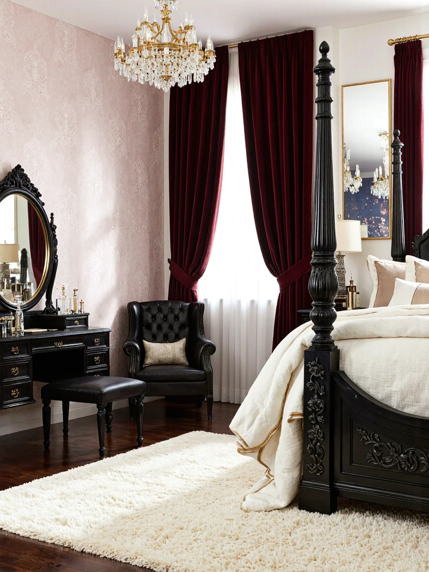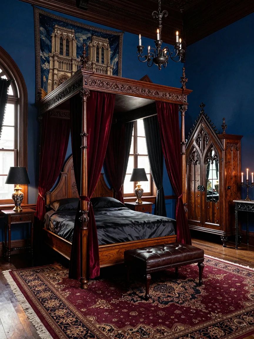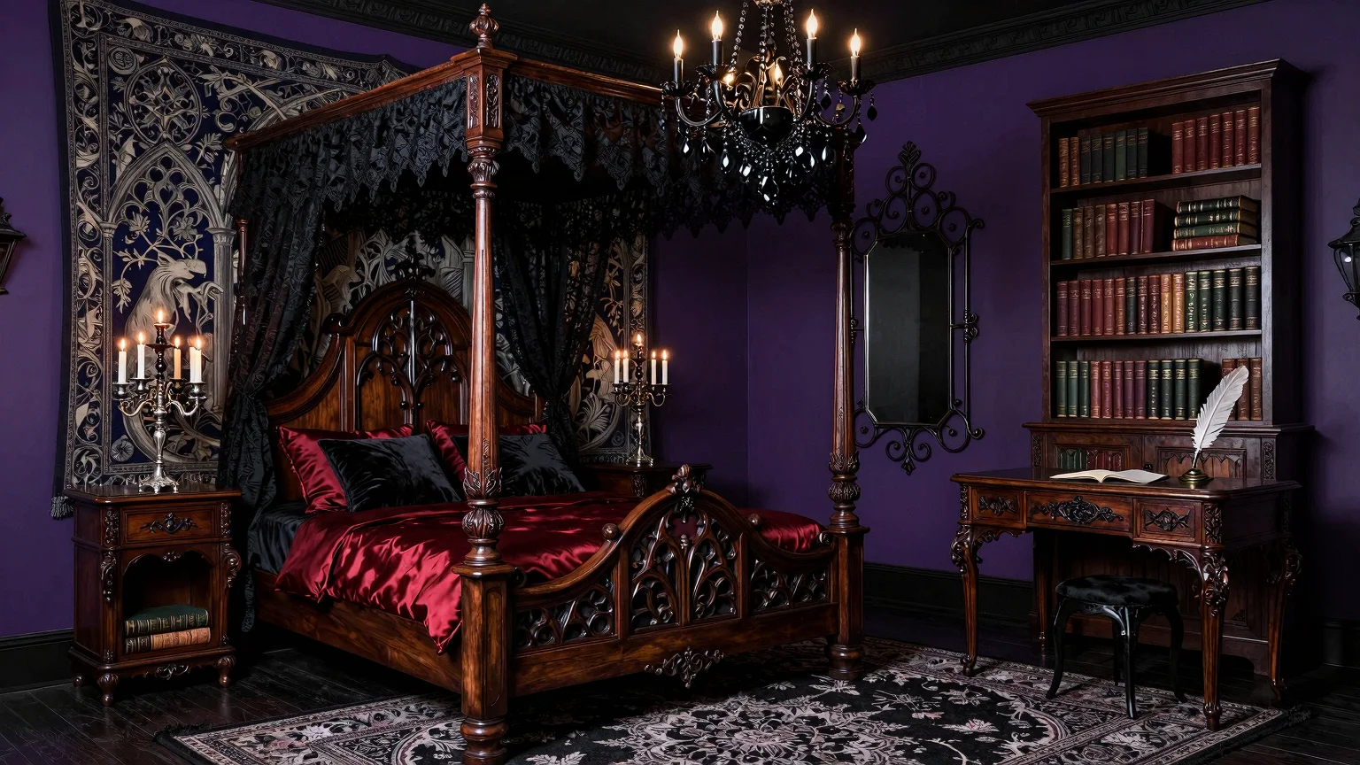 Gothic bedroom design featuring a four-poster bed with black lace curtains, mahogany furniture, satin crimson bedding, velvet pillows, antique candelabra, dark purple walls, gothic tapestry, wrought-iron mirror, bookshelves with leather-bound books, ornate rug, and elegant desk with quill pen set.