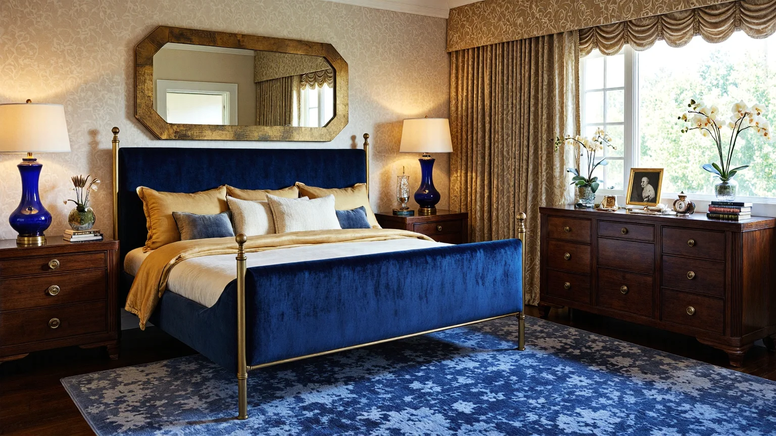 An elegant guest bedroom featuring a king-sized bed with a gold metal frame and blue velvet upholstery. Antique oak dresser with decorative items, an oversized mirror, and art deco console table. Nightstands with blue lamps, a plush rug, and gold brocade curtains framing a floor-to-ceiling window.