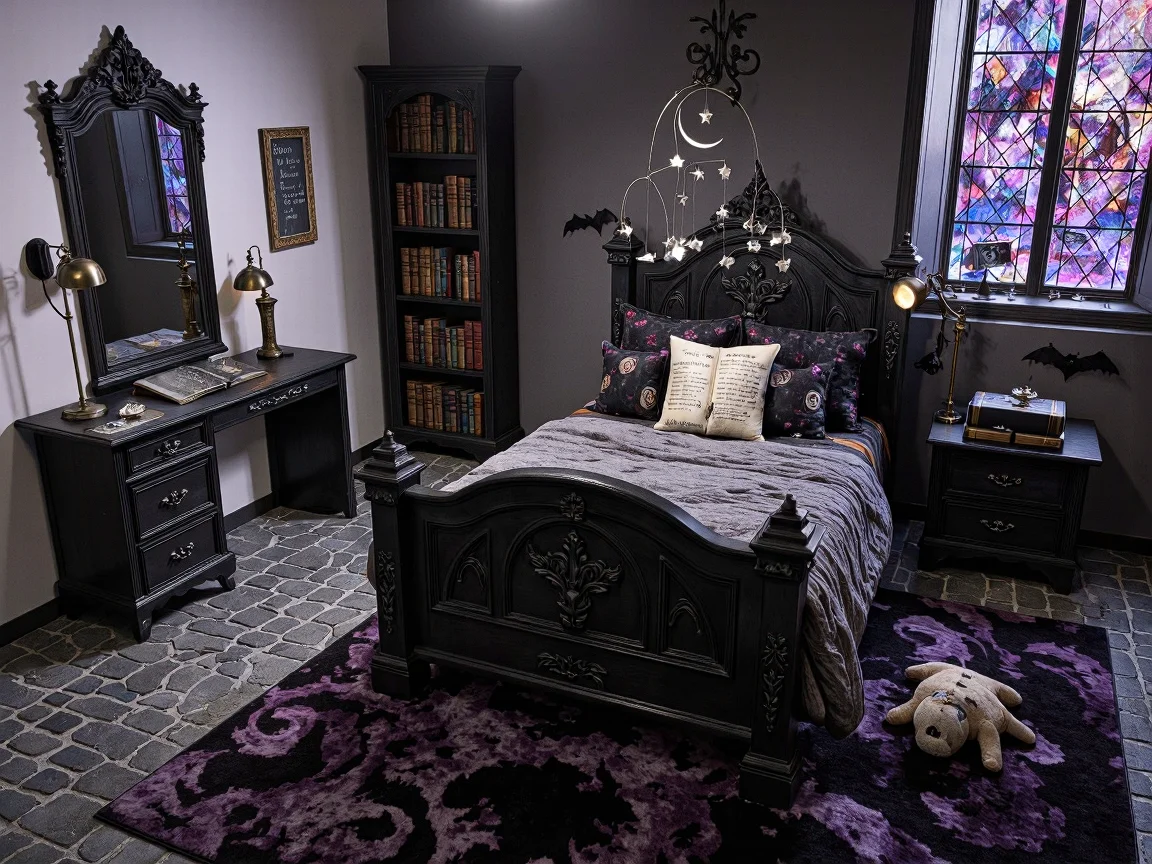 A Gothic-themed kids bedroom with a black bed, moonlight from a stained-glass window in purple and indigo, two nightstands with skeletal hand handles, an antique bronze lamp, a black writing desk with a 'Grimoire' book, a chalkboard-framed mirror, and a towering bookshelf filled with leather-bound books.