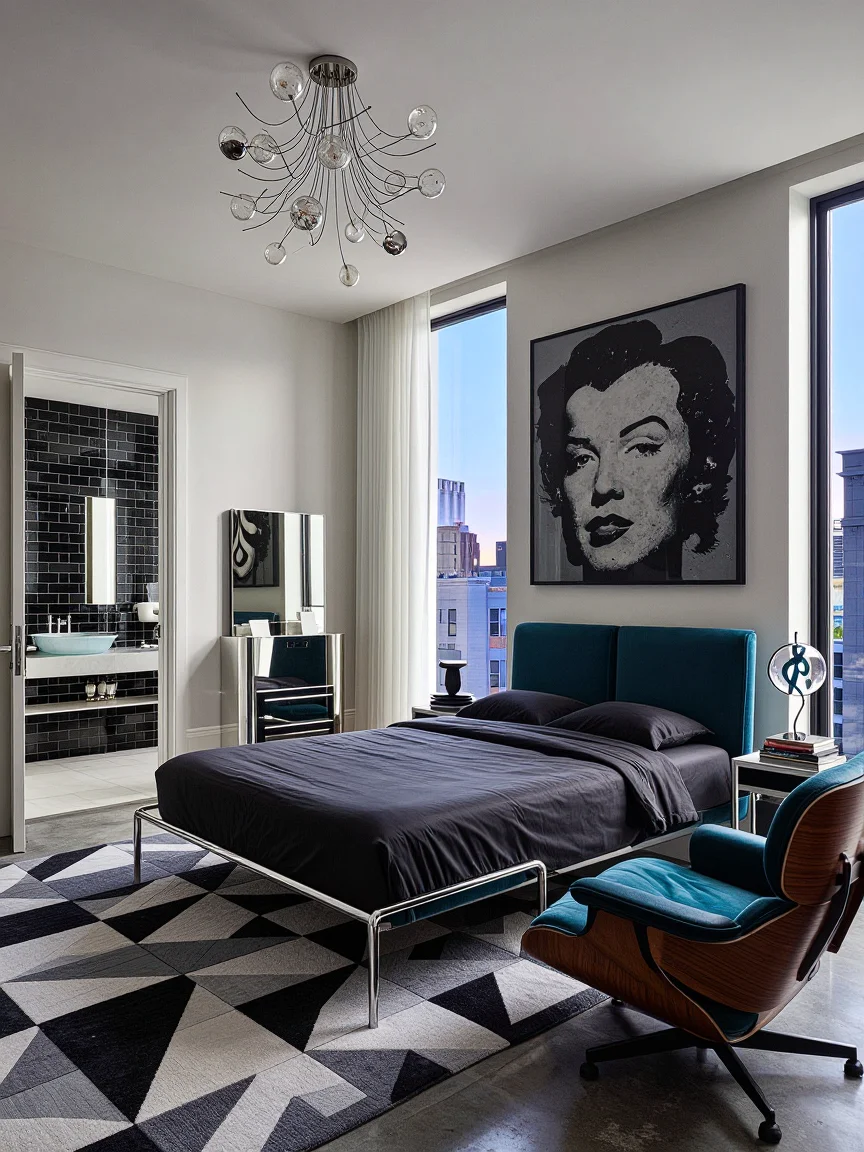 Postmodern master bedroom with a king-size platform bed in chrome steel, organic-shaped ceiling light, mirrored dresser, tall floor-to-ceiling window with urban skyline, monochromatic pop art painting, retro turquoise velvet chaise lounge, metallic side tables, sculptural lamp, and plush geometrical area rug.