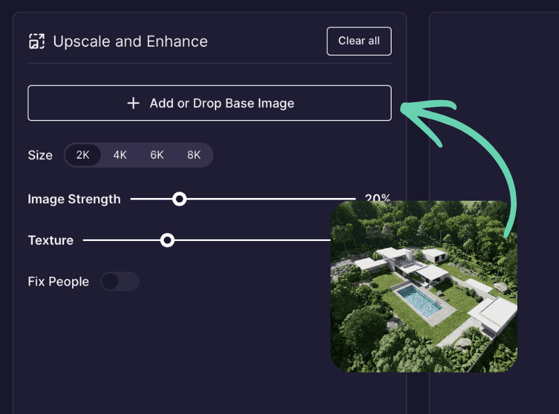 Lumion cria belas atmosferas. Rendair AI garante que essas atmosferas sejam capturadas em alta definição, removendo a 'suavidade' por vezes encontrada nas exportações do Lumion.