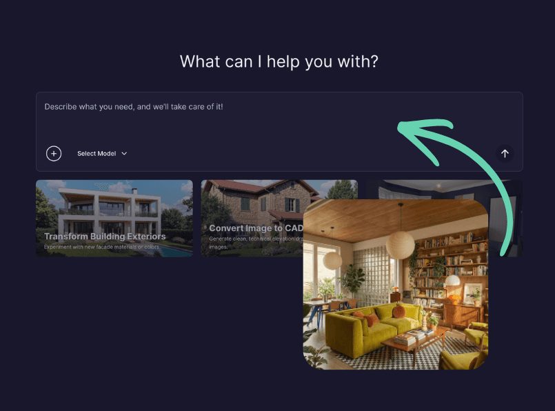 Upload an inspirational render or photo to extract its material palette and furniture style.