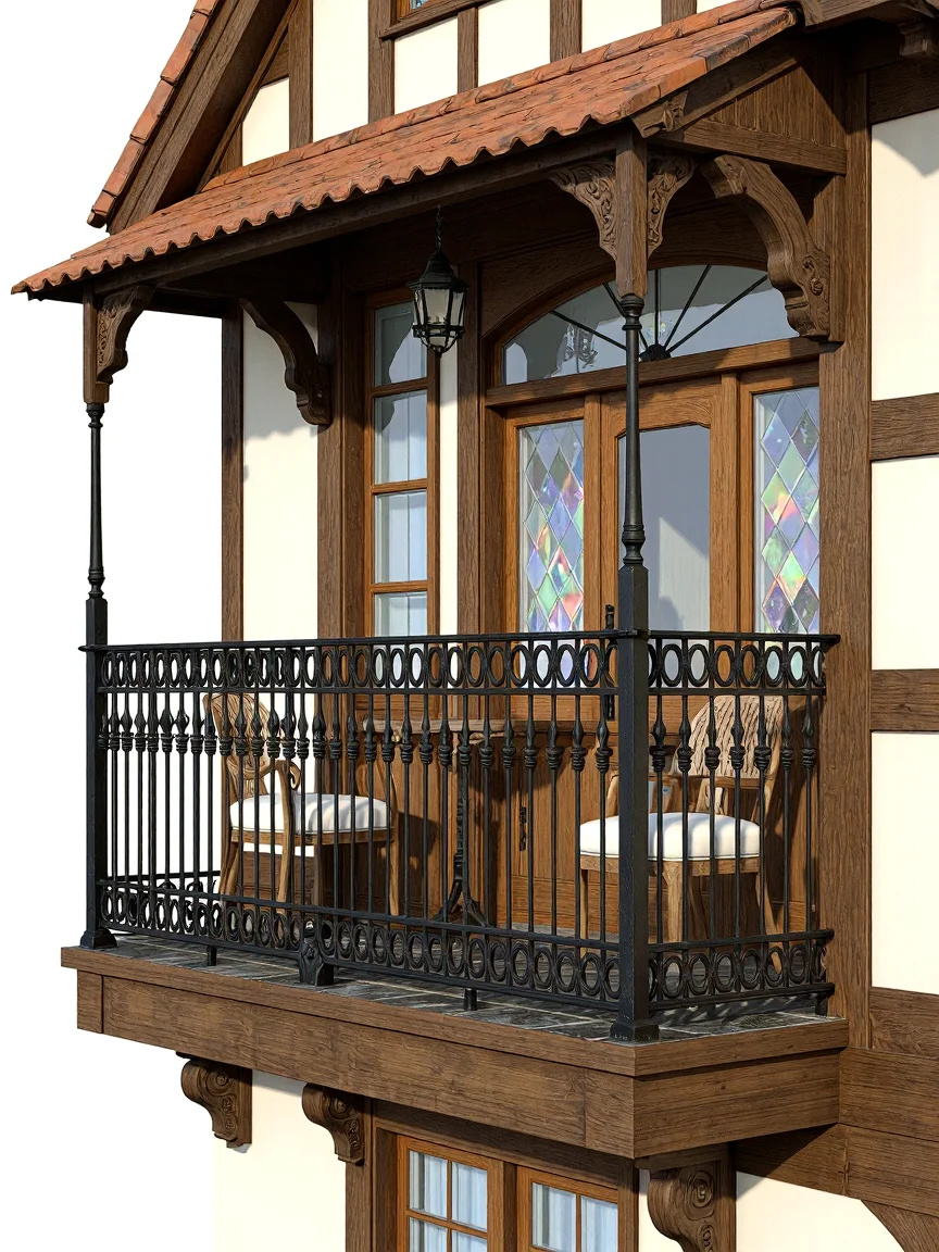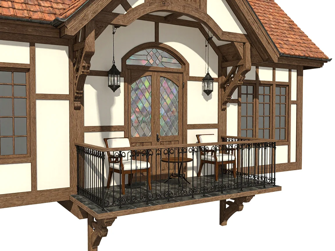 Tudor-style balcony design featuring a half-timbered house with walnut brown and off-white plaster. The balcony has ornate wooden corbels, dark slate tiles, and a black wrought-iron railing. A large arched door with leaded glass and tall casement windows, under a gabled roof with terracotta tiles. Includes antique wooden table and chairs with white cushions, and wrought iron pendant lanterns.