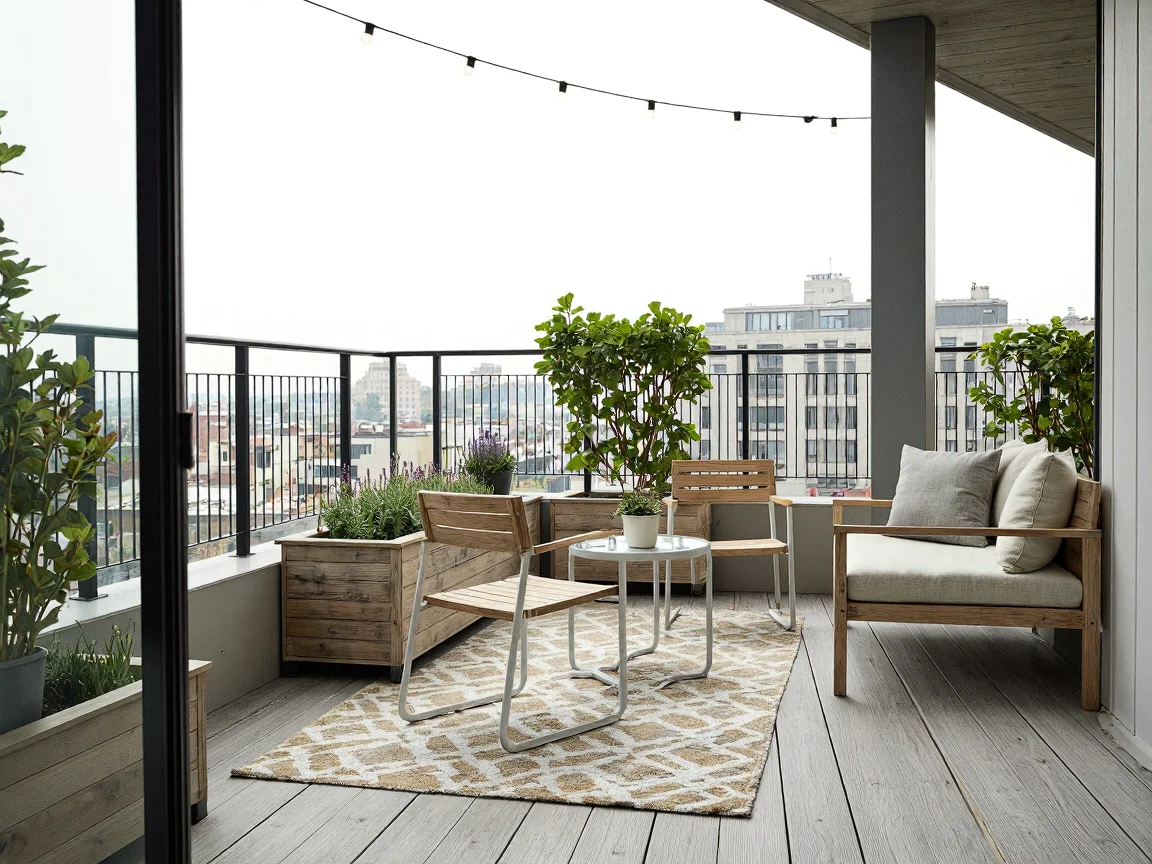 Scandinavian balcony with light gray wooden planks, matte black metal rails, lush green plants in a raised teak garden bed, a round glass coffee table with lavender, modern outdoor chairs of untreated teak wood, a recycled timber bench with neutral cushions, and LED fairy lights above.