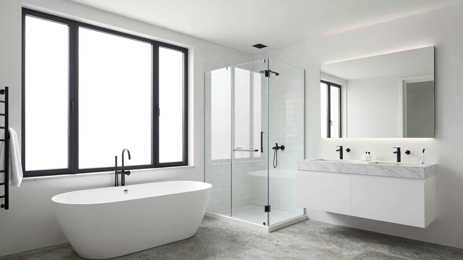 A sleek International Style bathroom with high ceilings, full-length windows, a wide vanity with a white marble countertop, a large mirror, a frameless glass shower cubicle, a freestanding matte white tub, and a grey concrete tile floor, all in a monochromatic palette of whites and greys with black accents.