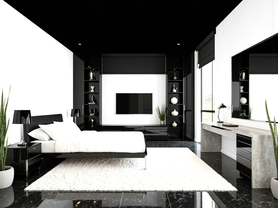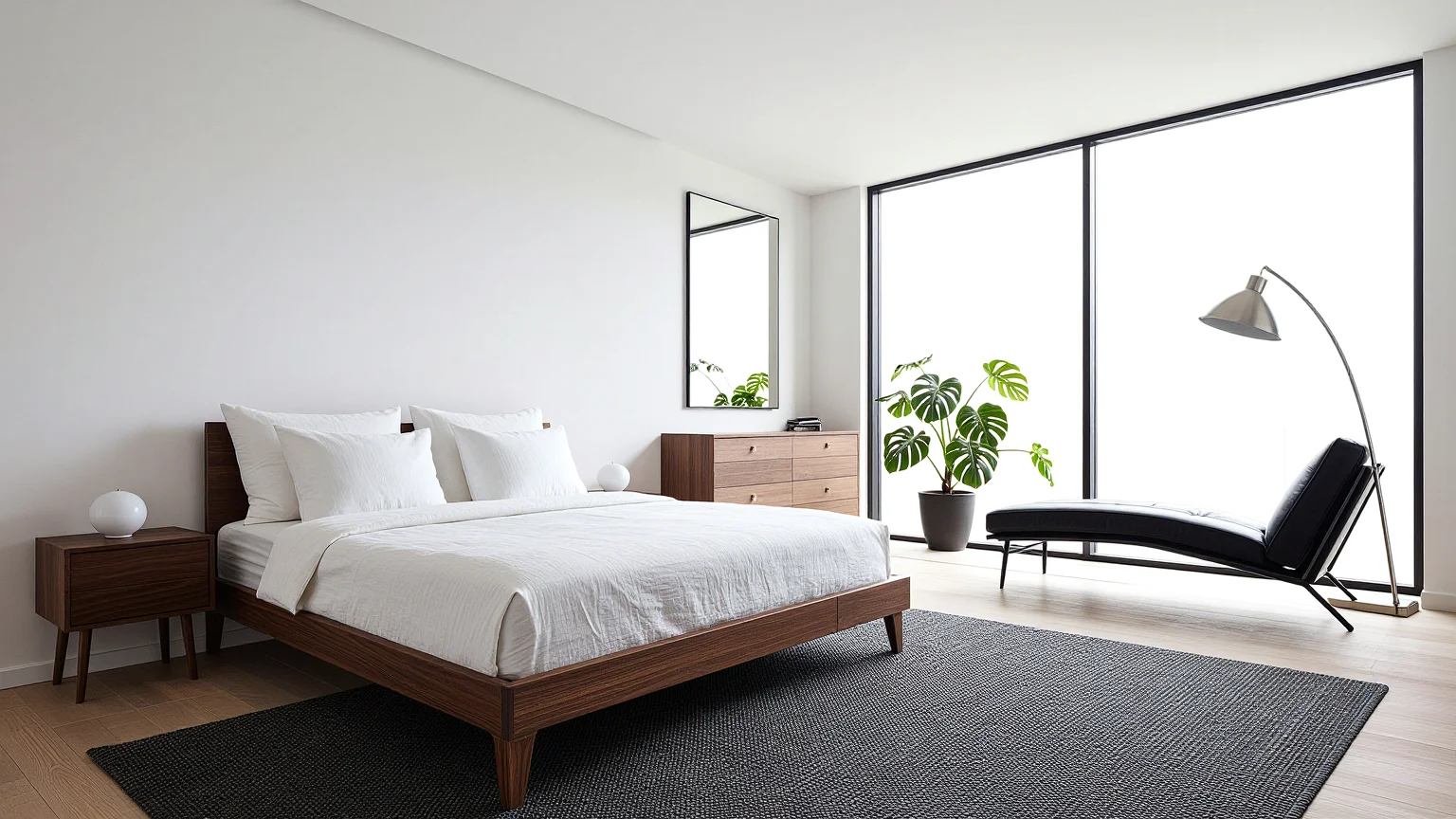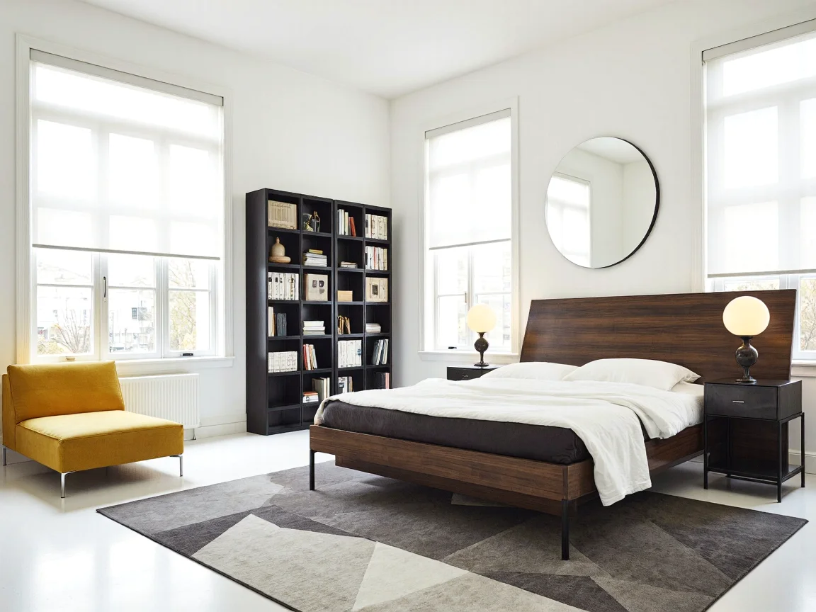 Bauhaus bedroom design with a clean white backdrop, minimalistic lines, dark walnut king-sized bed, crisp white bedding, cube-shaped black nightstands with spherical lamps, steel bookshelf with monochrome books, mustard-yellow chaise longue, geometric gray rug, large windows, and circular mirror.