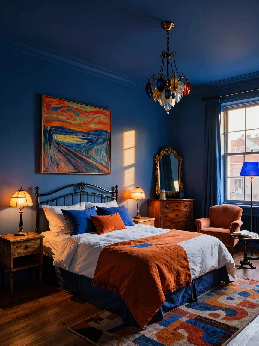 Expressionist guest bedroom featuring twilight light, cobalt blue walls, abstract painting, queen bed with wrought-iron headboard, geometric bedding, reclaimed wood nightstands, art-deco lamps, vintage dresser with mirror, avant-garde chandelier, burnt orange armchair, cobalt-blue floor lamp, hardwood flooring with abstract rugs.