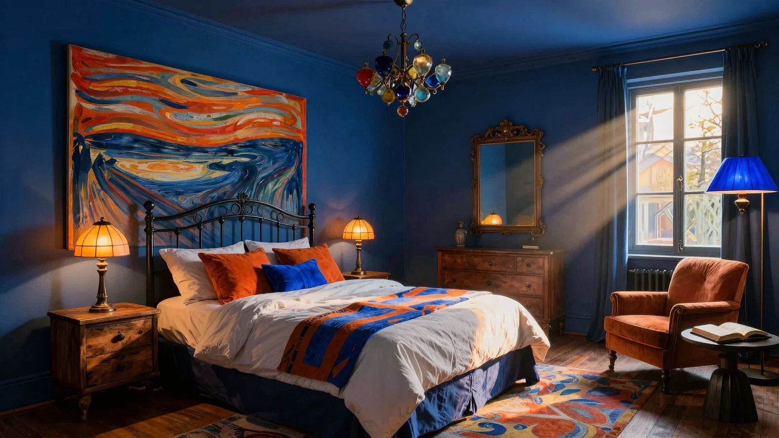 Expressionist guest bedroom with cobalt blue walls, warm golden light from sunset, abstract art, queen bed with wrought-iron headboard, rustic nightstands, art-deco lamps, vintage dresser with mirror, avant-garde chandelier, burnt orange armchair, hardwood flooring, plush area rugs.