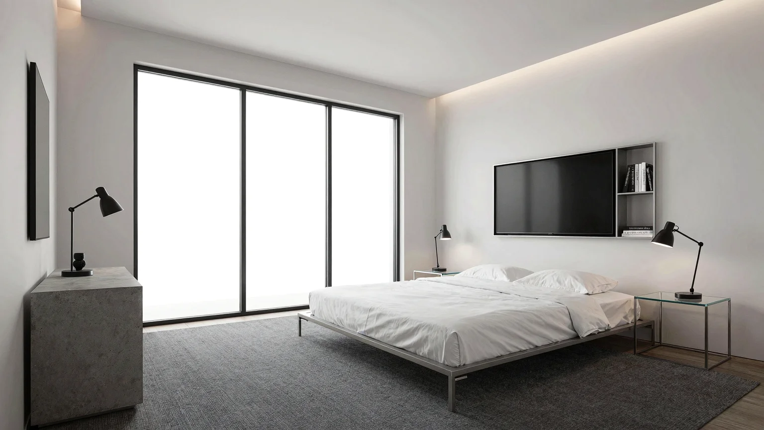 Master bedroom with city skyline view through glass wall, polished concrete floors, king-size bed with white linens, chrome and glass bedside tables, minimalist geometric lamps, built-in glossy white closet, oversized black-and-white photograph, elongated wooden workspace with clean lines, recessed ceiling lights.