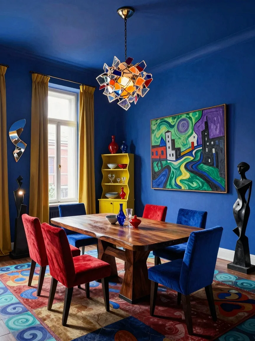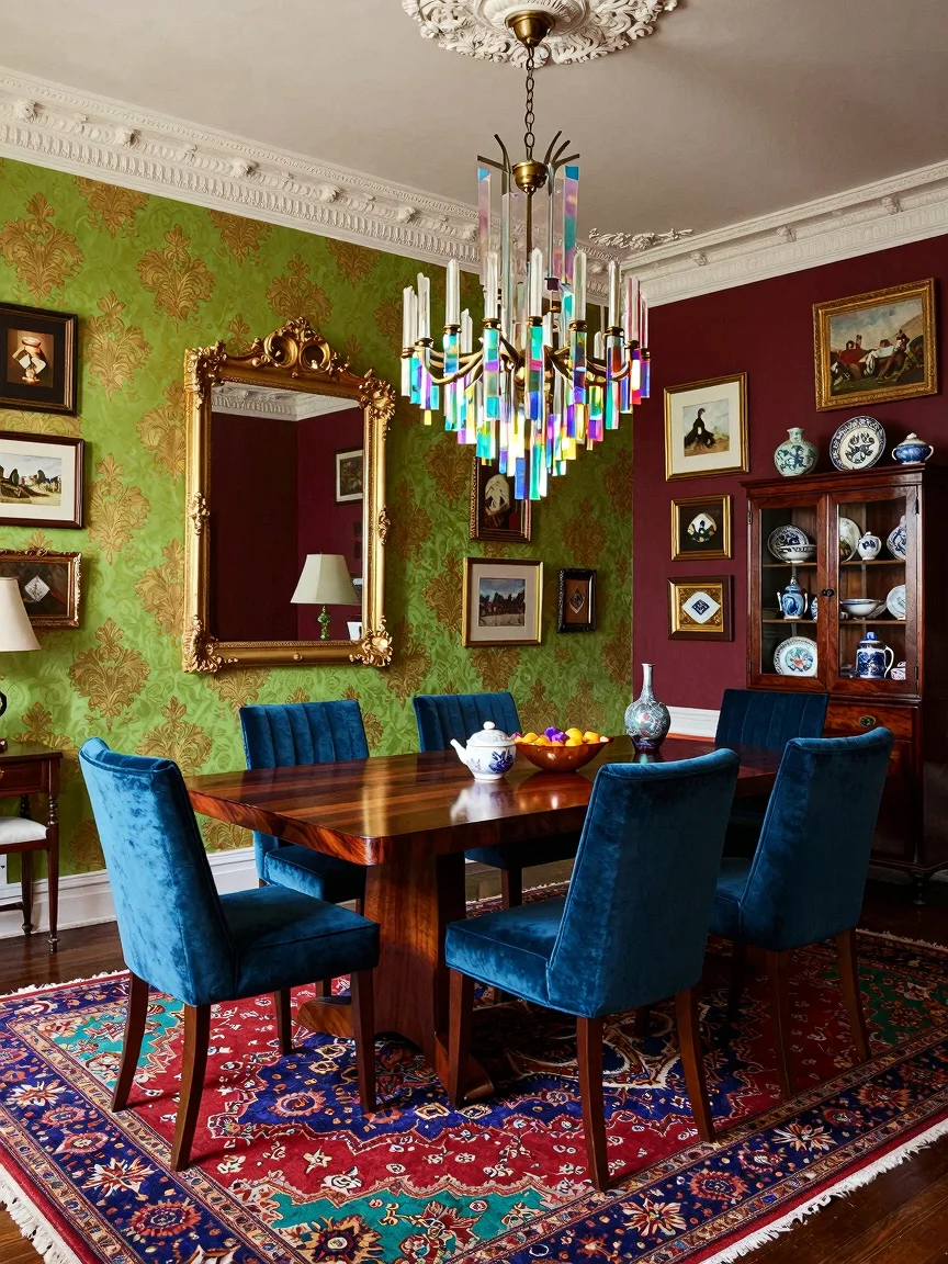 A vibrant maximalist dining room with a large mahogany table, sapphire velvet chairs, an iridescent chandelier, bold green and gold wallpaper, a burgundy wall with a gold-framed mirror, eclectic artwork, a mahogany cabinet with colorful porcelain, and a jewel-toned Persian rug.